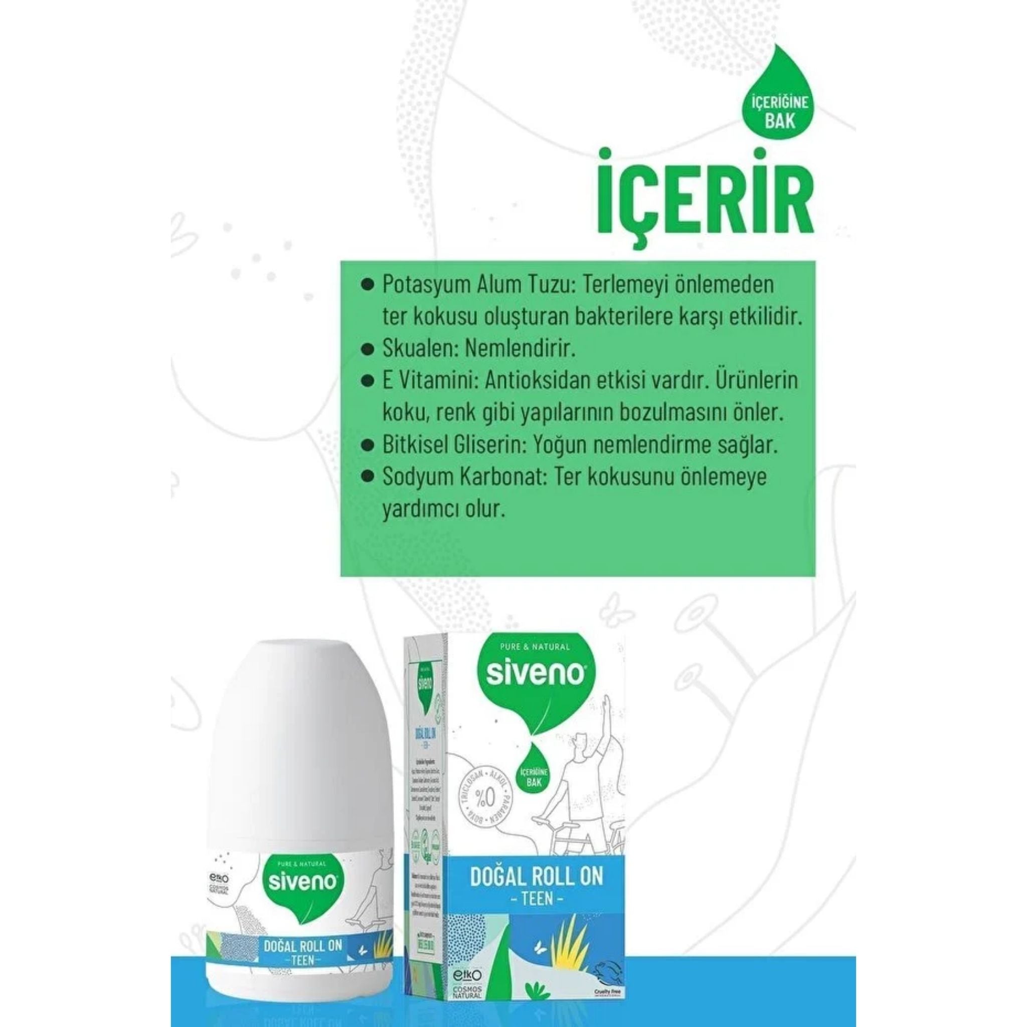 Siveno %100 Doğal Roll-On Teen Blue 50 ml, 10 yaş ve üzeri erkek çocukların hassas ciltleri için özel olarak geliştirilmiş, tamamen bitkisel içerikli bir deodoranttır. Gözenekleri kapatmadan terlemeye engel olmadan yalnızca kötü kokulara neden olan bakterileri etkisiz hale getirir. Hafif, ferah kokusu ve doğal yapısıyla günlük kullanım için mükemmeldir. Vegan, hipoalerjenik ve doğa dostu formülüyle çocuklar için güvenli bir kişisel bakım sunar. Siveno %100 Doğal Roll-On Teen Blue, kimyasal içeriklerden uzak, bitkisel ve doğal bileşenlerle formüle edilmiştir. Gün boyu ferahlık, güvenli koruma ve nazik bakım sunar. Çocuklarınız için doğanın en saf haliyle üretilmiş bu Roll-On, kişisel bakım rutininde vazgeçilmez bir parça olacaktır.