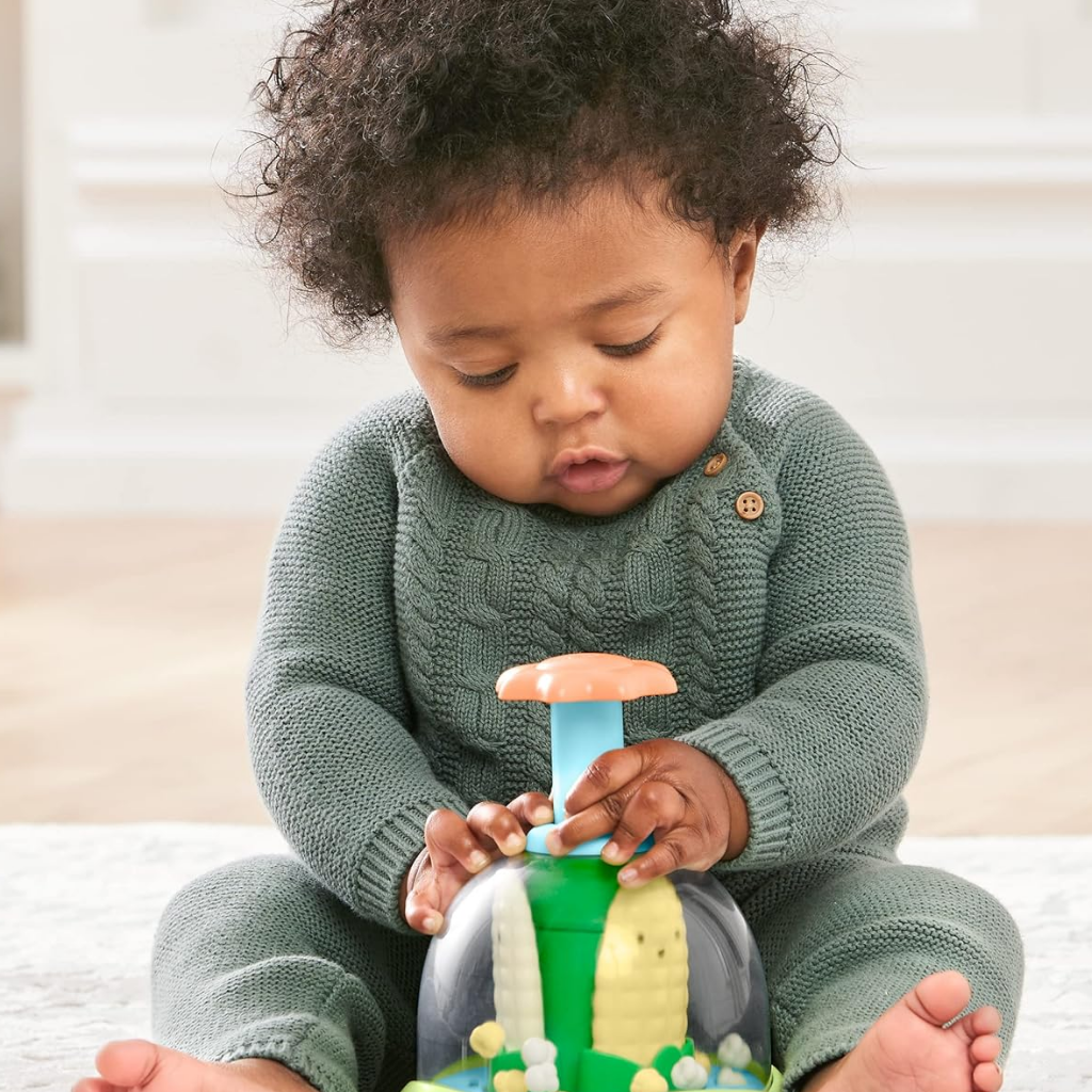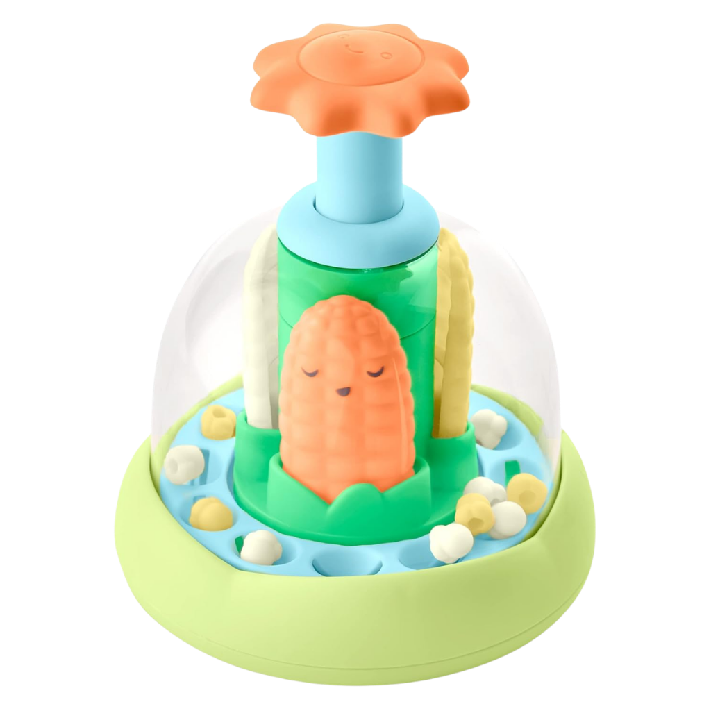 Skip Hop Farmstand Aktivite Oyuncağı Mısır Patlatma, klasik it ve çevir oyuncak tasarımına eğlenceli bir dokunuş katar. Dost canlısı güneş figürünü yukarı doğru ittiğinizde mısır taneleri dönmeye ve zıplamaya başlar. Hareketle birlikte çıkan patlama sesleri bebeğinizin dikkatini çeker ve keşfetme isteğini artırır. Skip Hop Farmstand koleksiyonunun bir parçası olan bu aktivite oyuncağı, 6 ay ve üzeri bebekler için uygundur. Güneşe basıldığında mısır koçanları yukarı aşağı hareket eder ve şeffaf hazne içindeki “patlamış mısırlar” zıplayarak görsel bir şölen oluşturur. Bu mekanik yapı, bebeğin neden sonuç ilişkisini deneyimleyerek öğrenmesine yardımcı olur. Döndürme ve itme hareketleri ince motor becerilerini destekler. El göz koordinasyonu ve kavrama refleksinin gelişimine katkı sağlar. Kompakt tasarımı sayesinde küçük eller için uygundur ve masa üstünde veya yerde rahatlıkla kullanılabilir. Skip Hop Farmstand Aktivite Oyuncağı Mısır Patlatma, görsel ve işitsel uyarıcıları bir araya getirerek bebeğinizin hem eğlenmesini hem de öğrenmesini destekleyen interaktif bir oyuncaktır.