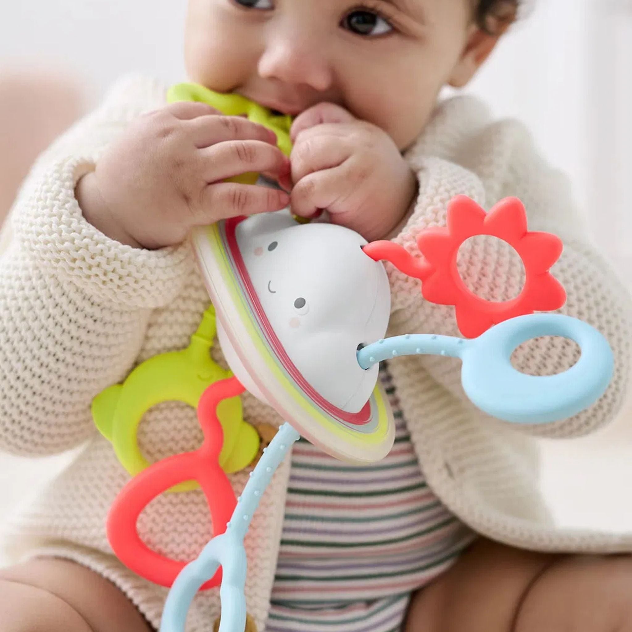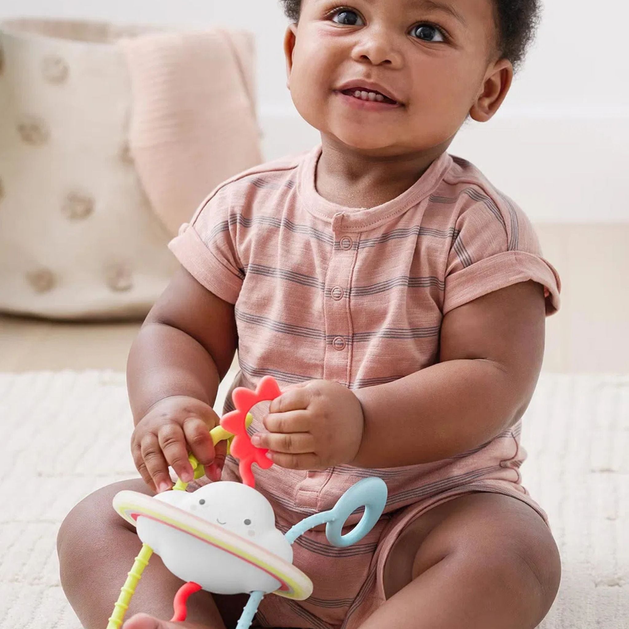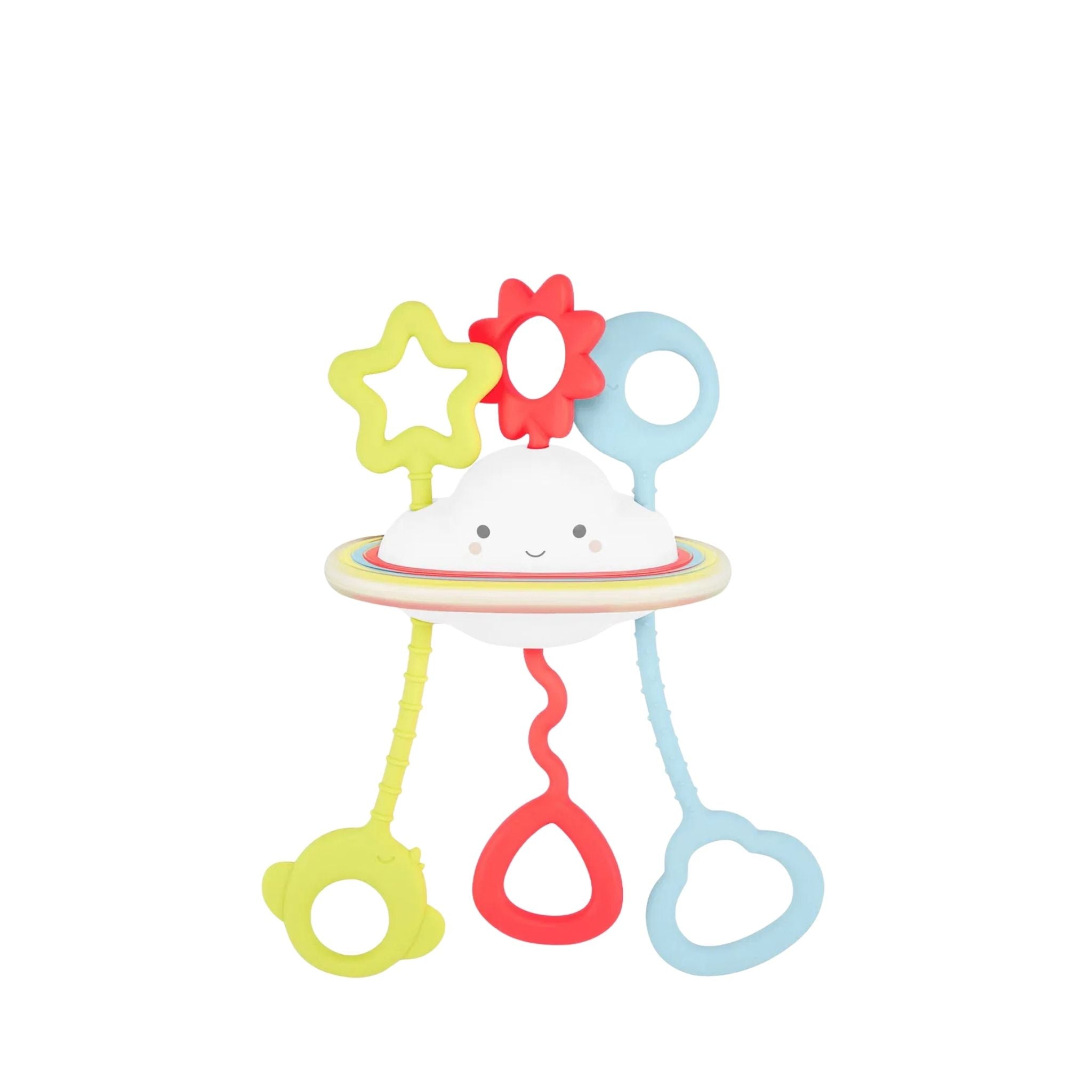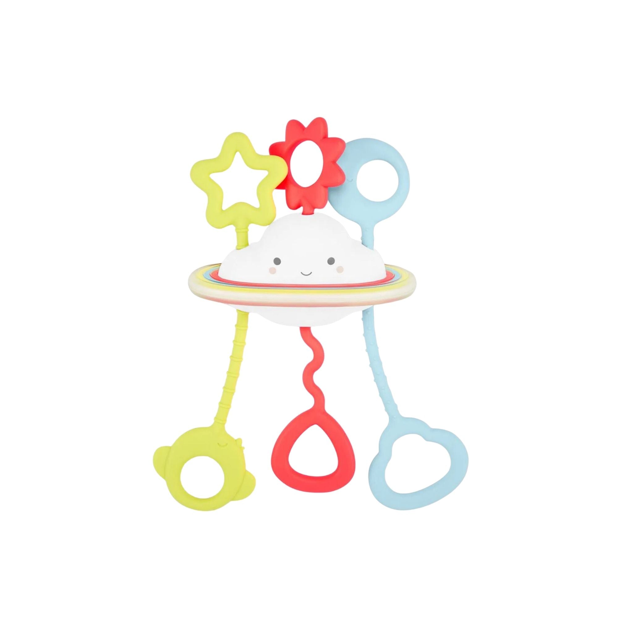 Skip Hop’un Silver Lining Cloud koleksiyonuna ait bu sevimli bulut oyuncak, 6 ay ve üzeri bebeklerin duyusal keşfini desteklemek için tasarlanmıştır. Yumuşak silikon çekicileri ve çoklu dokuları sayesinde bebekler için diş çıkarma döneminde rahatlatıcı bir deneyim sunar. Üzerindeki göksel şekiller ve farklı yüzeyler, miniklerin dokunma, görme ve işitme duyularını harekete geçirir. Çekiciler çekildiğinde farklı sesler çıkararak bebeğin ilgisini çeker ve oyun sırasında neden-sonuç ilişkisini öğrenmesine yardımcı olur. Ayrıca ince ve kaba motor becerilerinin yanı sıra el-göz koordinasyonunun gelişimini destekler. Hafif ve kolay kavranabilir yapısıyla bebeğinizin oyun zamanına eğlence katar.