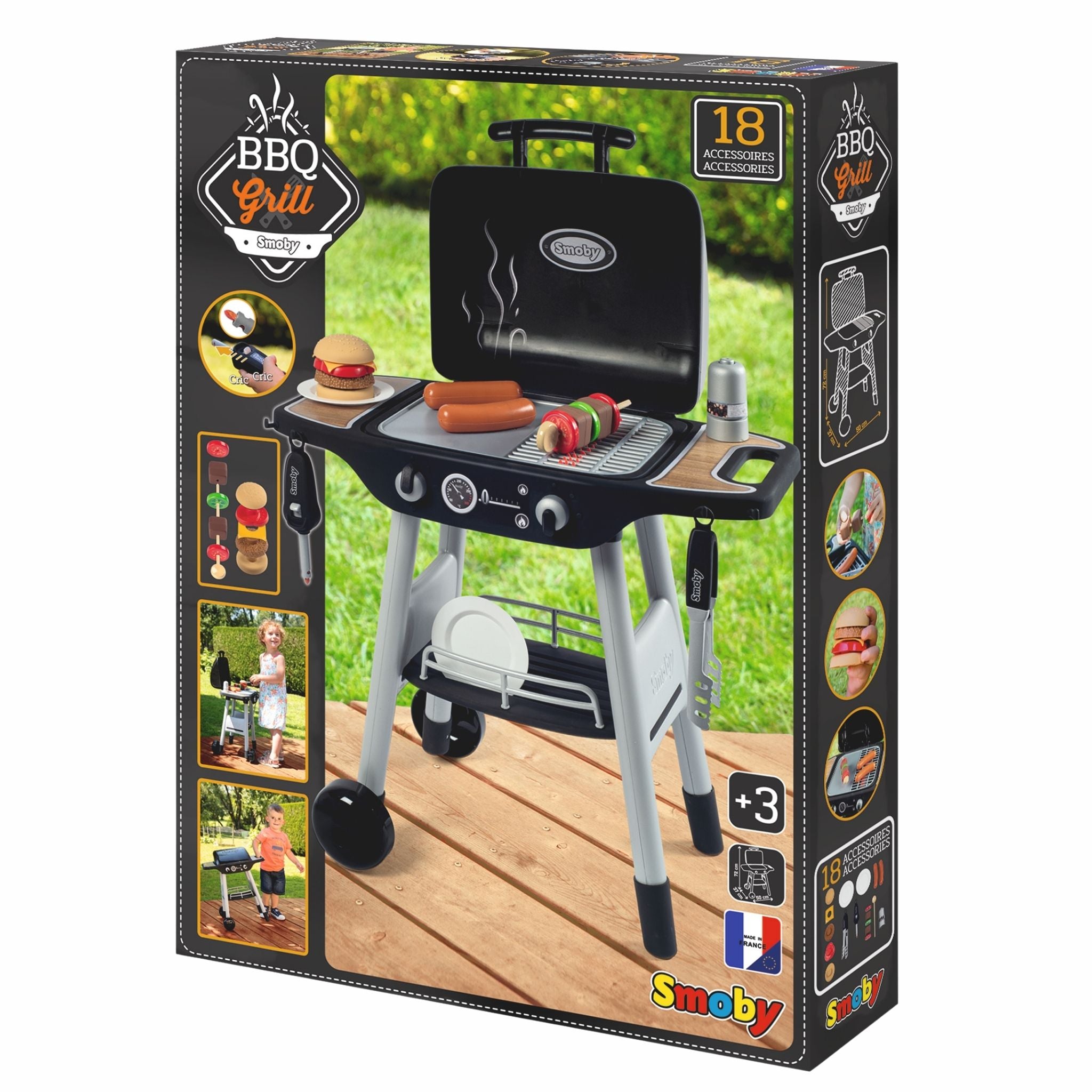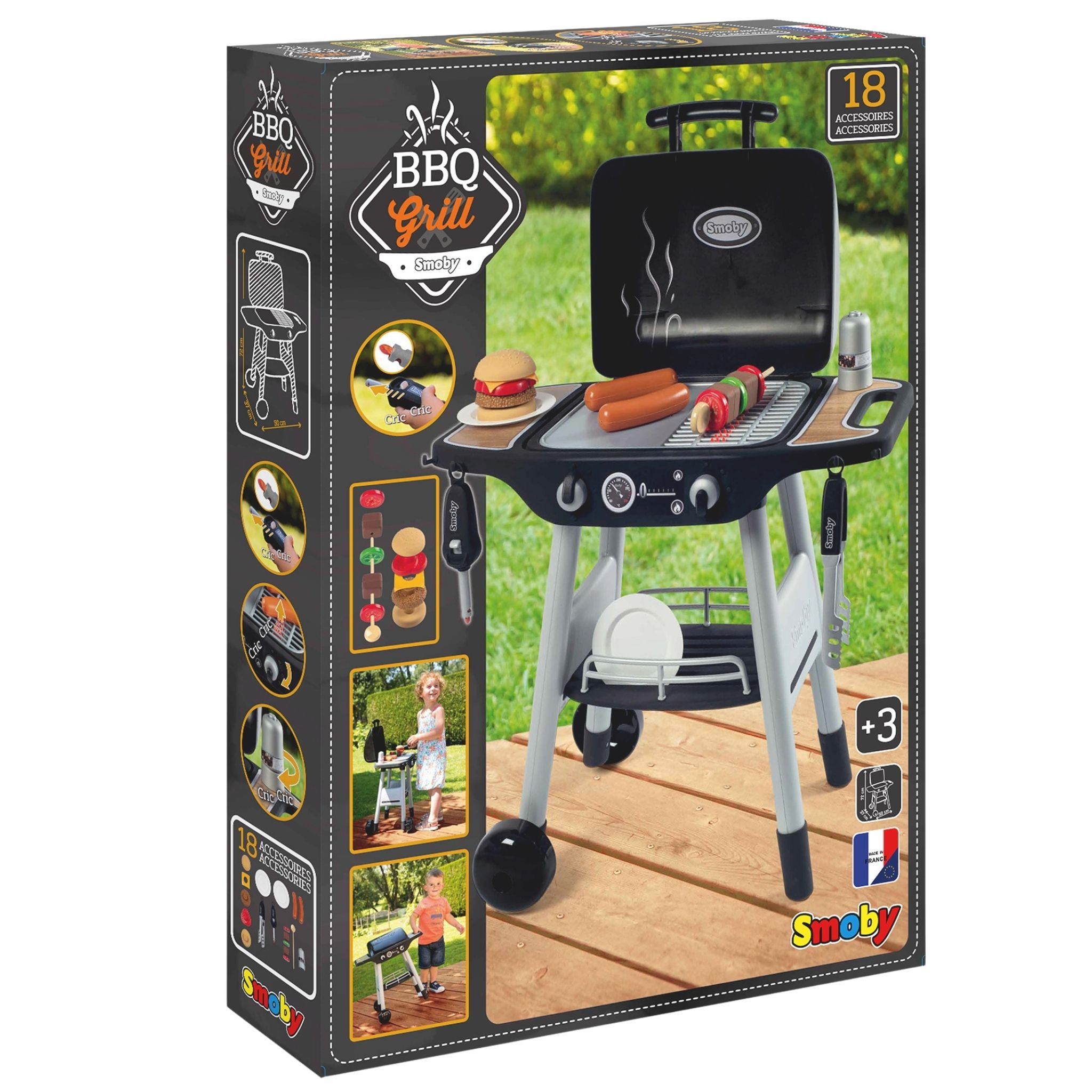 Smoby Barbekü Oyun Seti, çocukların dış mekanda ya da oyun odasında keyifle kullanabileceği gerçekçi bir grill deneyimi sunar. Barbekü temalı bu oyun seti, minik ustaların hayal güçlerini kullanarak hamburger hazırlama, ızgara yapma ve rol oyunları geliştirmesine yardımcı olur. Mekanik düğme sayesinde gerçek ateş görünümüne yakın bir efekt oluşturulabilir ve bu sayede oyun daha heyecanlı hale gelir. Çeşitli yiyecek parçaları, baharat aksesuarları, tabak ve maşa gibi detaylarla donatılmış olan set; çocukların el becerisini, sosyal iletişimini ve yaratıcılığını destekler. Tekerlekli yapısı sayesinde istenilen alanda kolayca taşınabilir ve hem iç mekanda hem dış mekanda kullanıma uygundur. Sağlam ve kaliteli malzemelerle üretilmiş olması, uzun süre dayanıklılık sağlar. 5 farklı parçayı birleştirerek hamburger yapılabilmesi ve mangal şişiyle ızgara malzemeleri pişirme oyunu gibi interaktif aktiviteler, çocukların ilgisini çeker ve gerçek bir barbekü deneyimi yaşatır.