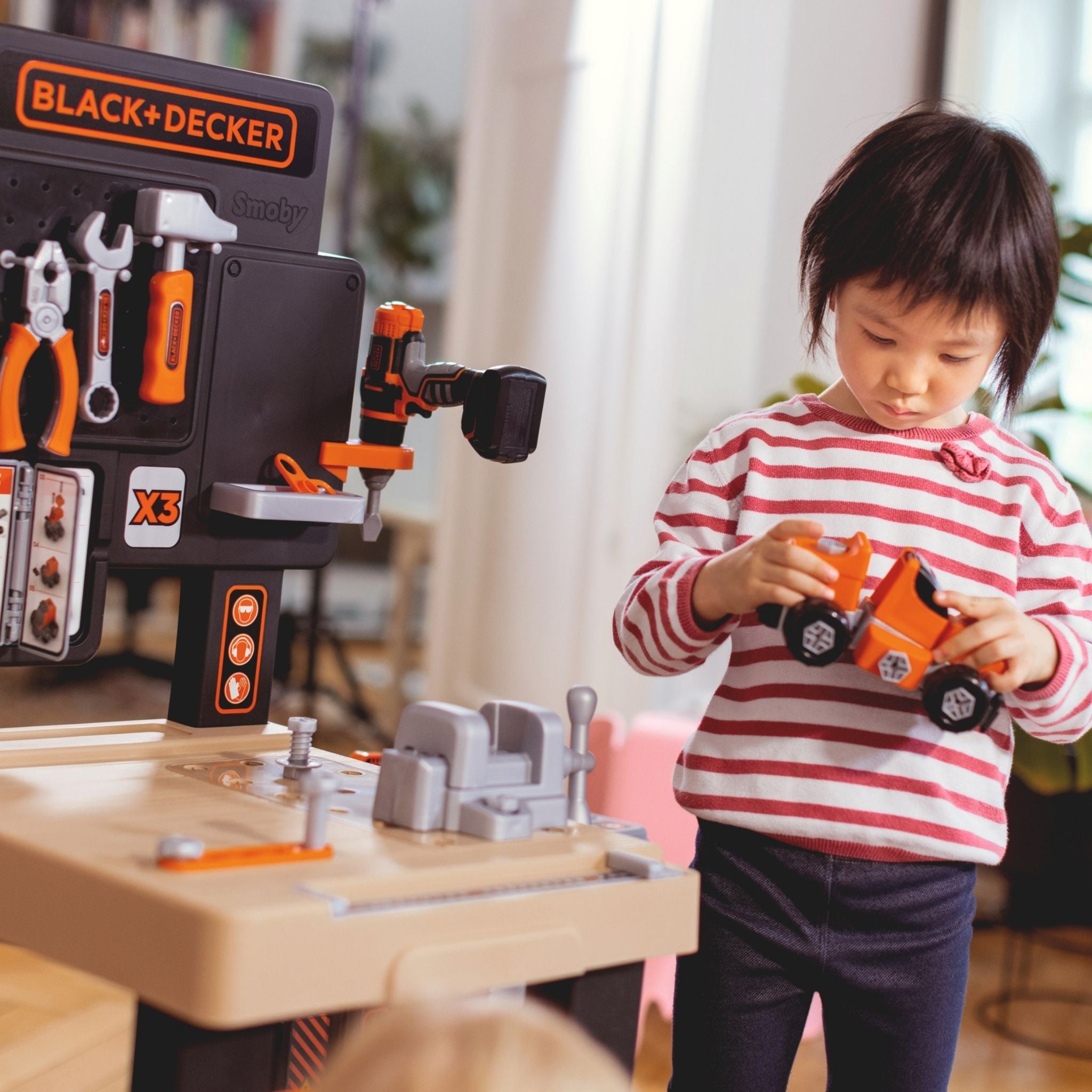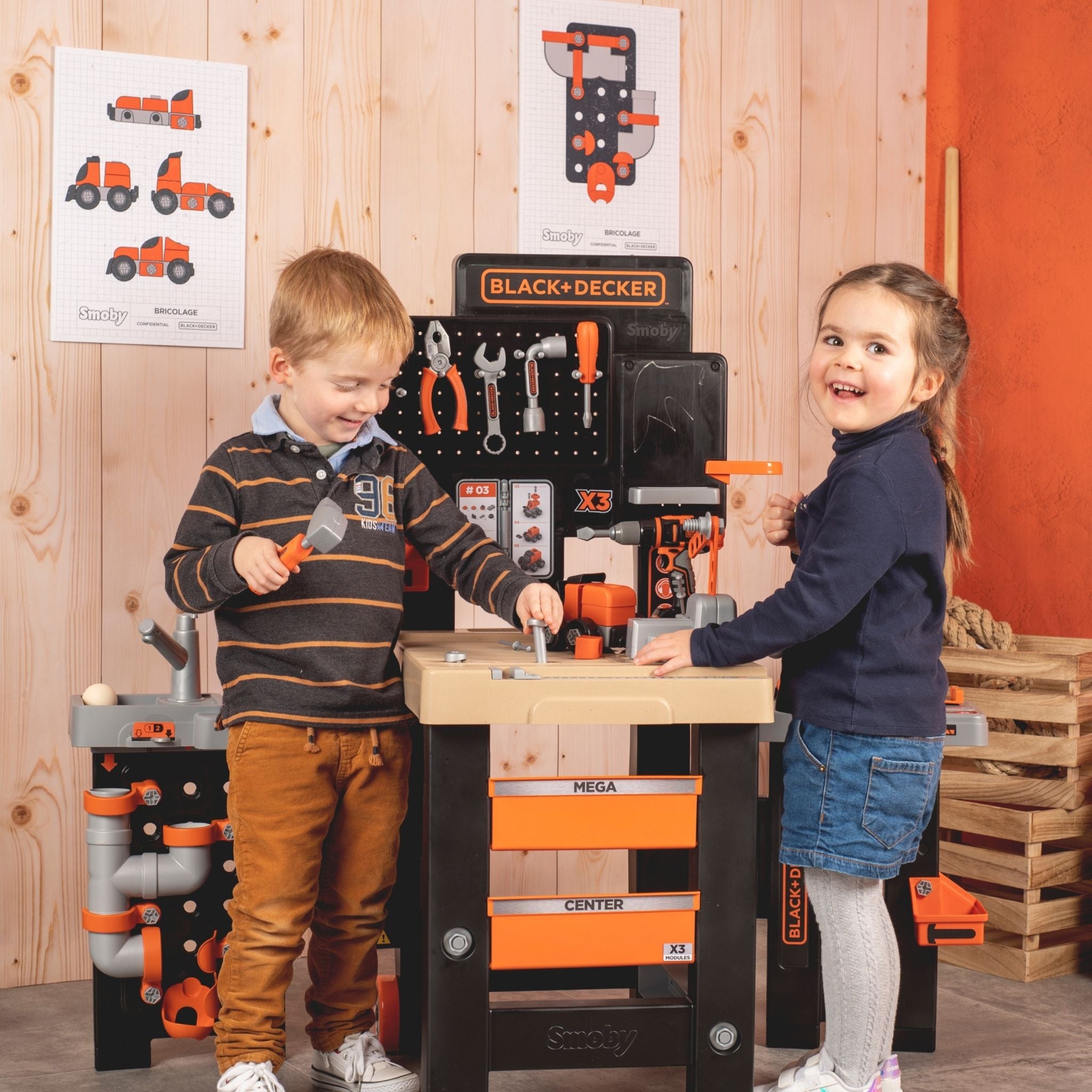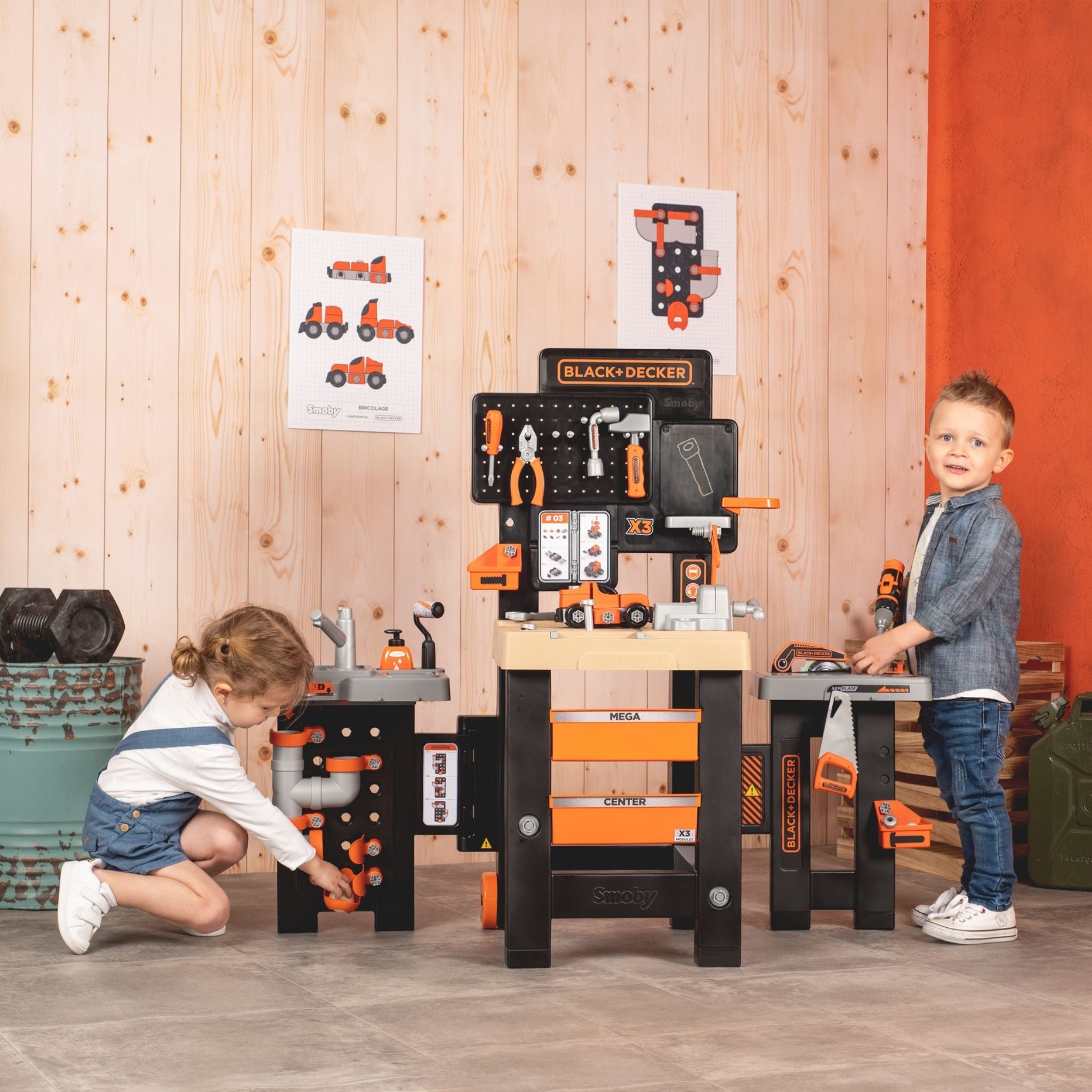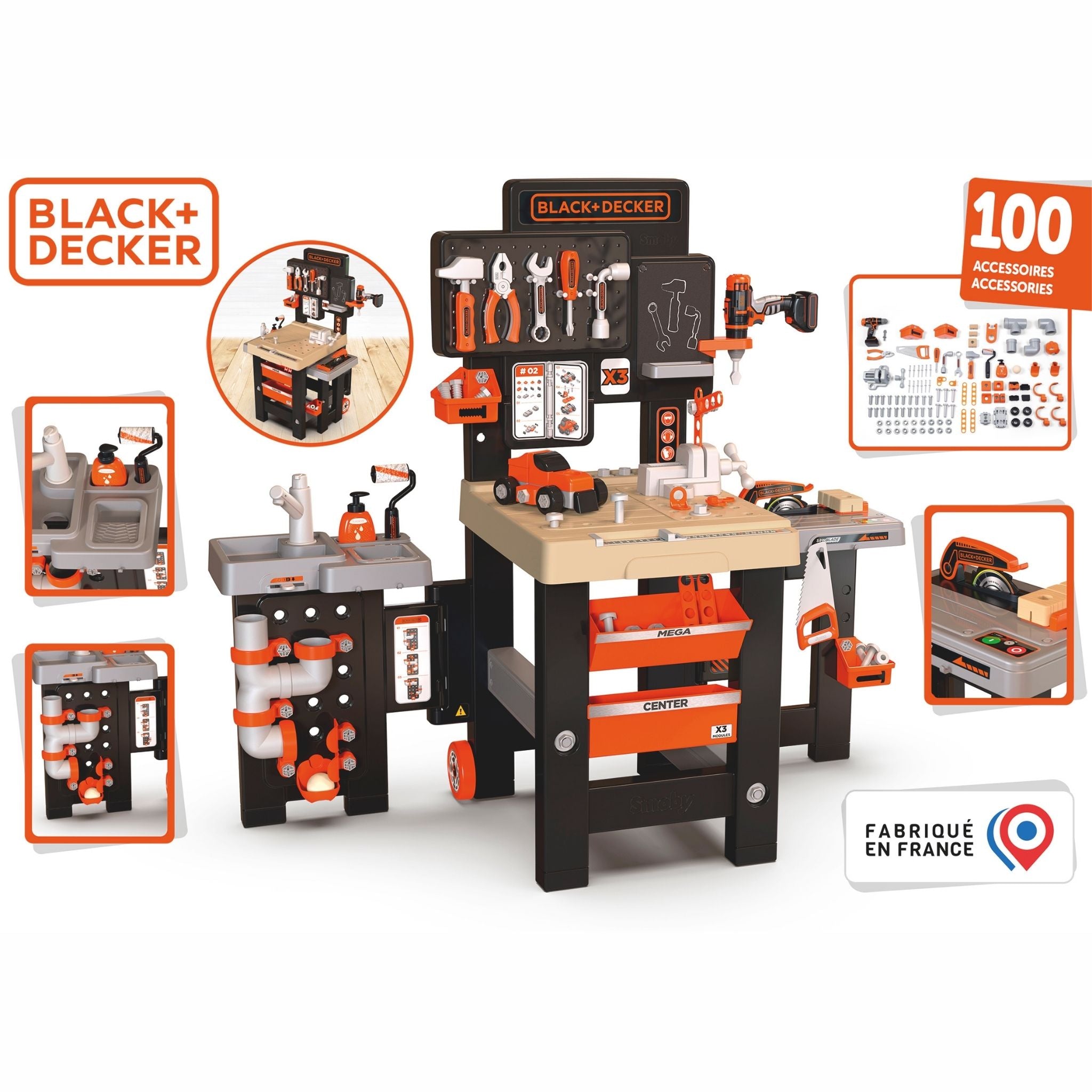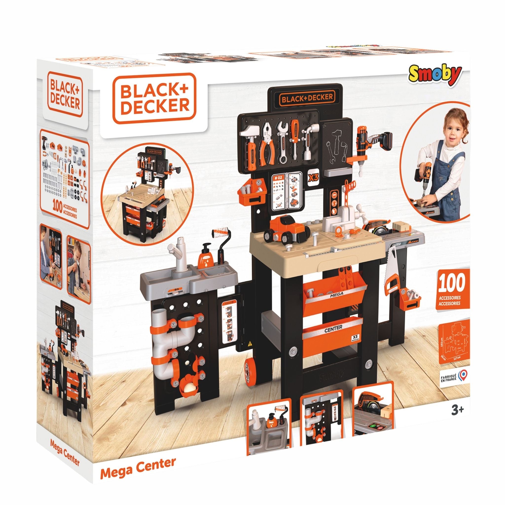 Smoby Black & Decker Mega Tamir Tezgâhı, küçük ustaların hayal gücünü geliştiren kapsamlı bir rol yapma setidir. Gerçek bir tamir atölyesini andıran bu büyük merkez, vidalama, çekiçleme, boyama, kesme ve tesisat gibi pek çok farklı çalışma alanını tek bir tezgâhta birleştirir. Çocukların el becerilerini geliştirmelerine ve problem çözme yeteneklerini keşfetmelerine yardımcı olurken aynı zamanda güvenli oyun deneyimi sunar. Geniş çalışma yüzeyi, mekanik tornavida ve çok parçalı aksesuar seti ile uzun süreli oyun keyfi vadeder. Black & Decker lisanslı tasarımı sayesinde gerçekçi bir atölye görünümü sağlar ve çocukların yaratıcılığını destekler. İki kanadının kapanabilir yapısı ve tekerlekli sistemi sayesinde kolayca taşınabilir ve saklanabilir.