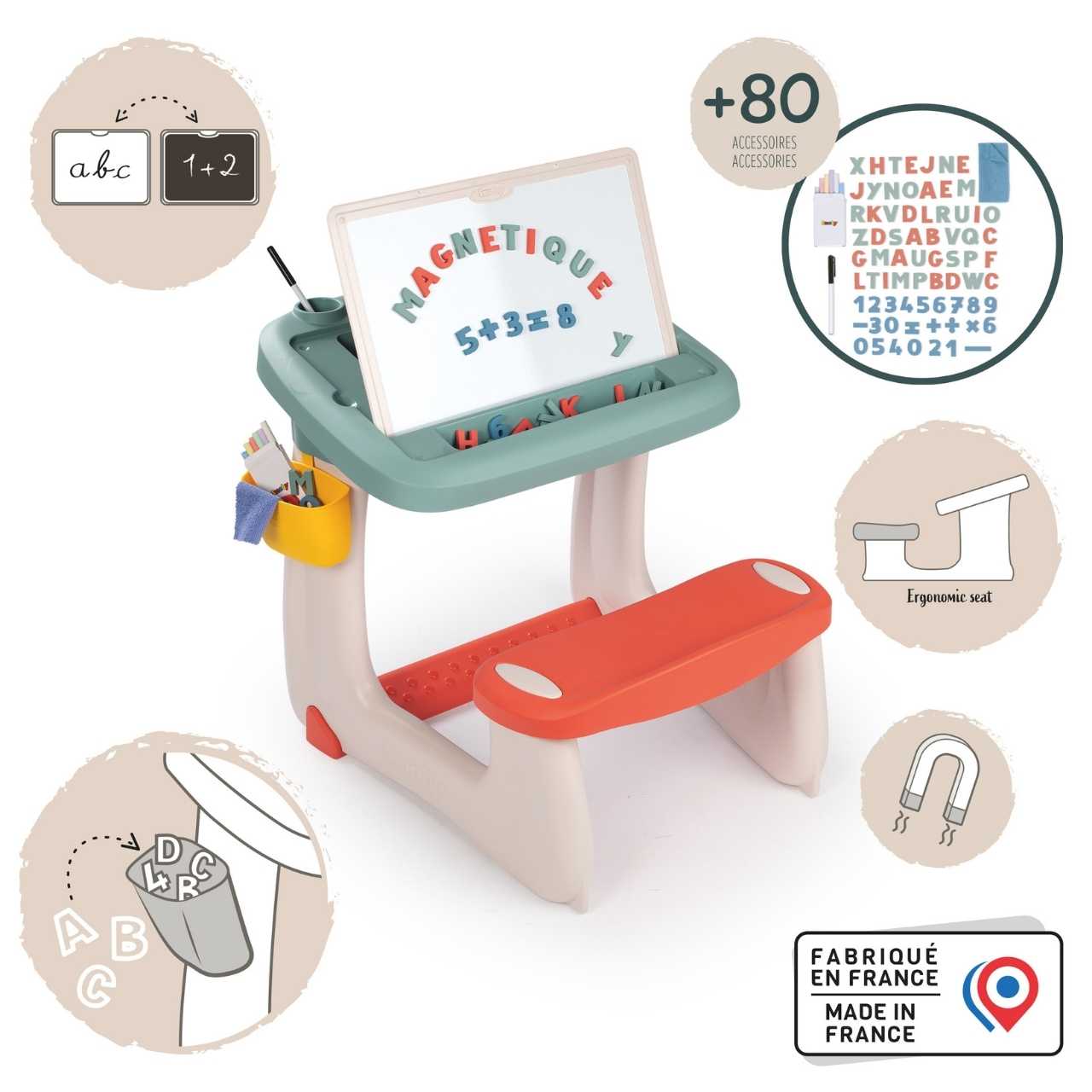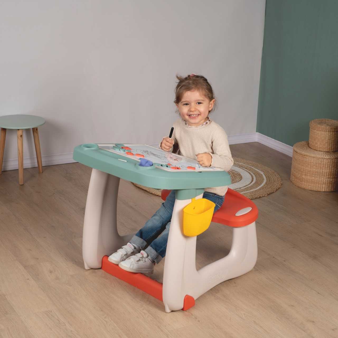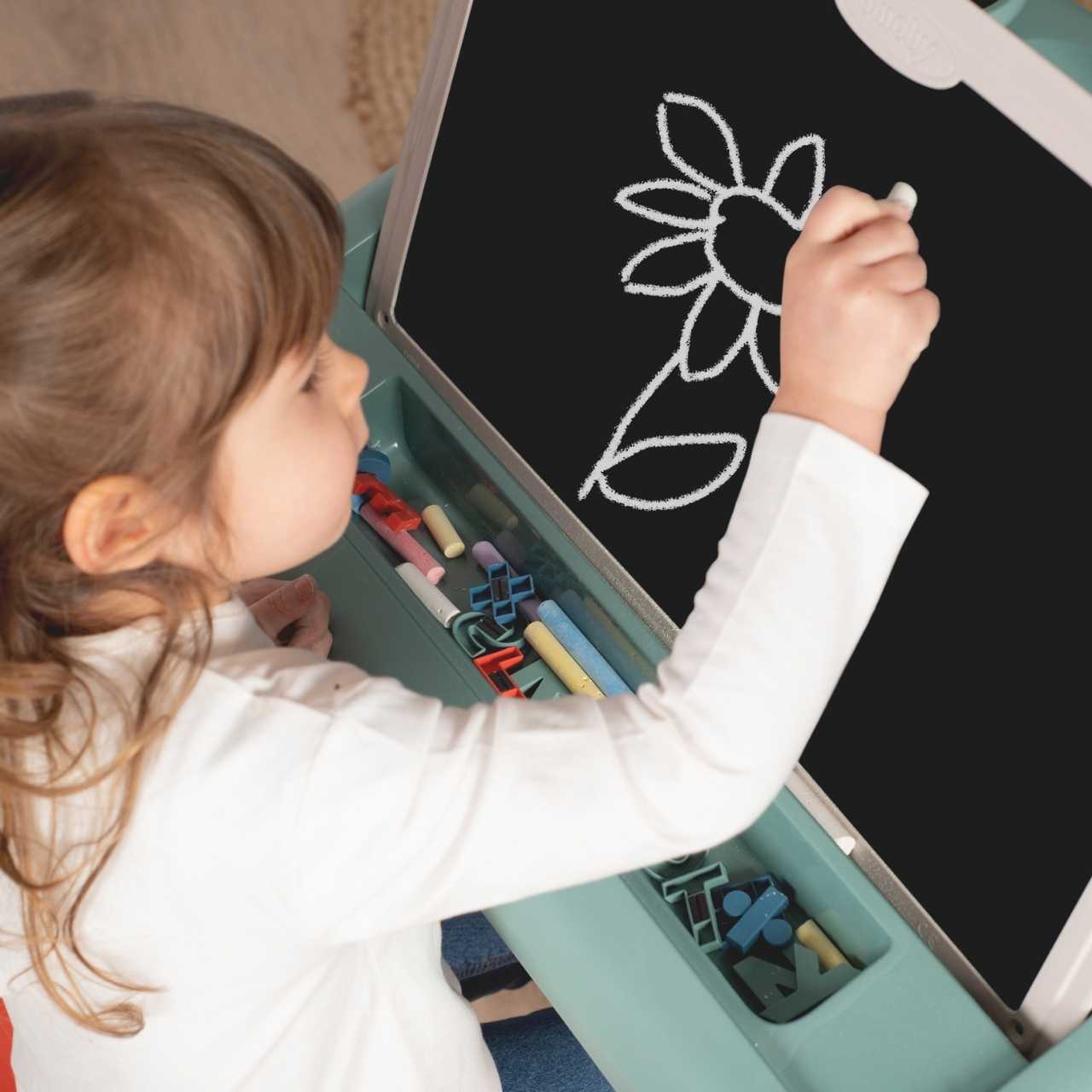 Smoby Çift Taraflı Çalışma Masası, 3 yaş ve üzeri çocuklar için özel olarak tasarlanmış ergonomik ve çok fonksiyonlu bir öğrenme masasıdır. Masanın çift taraflı yüzeyi, siyah tahta kısmı tebeşirle matematik ve yazma egzersizlerine uygunken, beyaz tahta kısmı suda çözünebilen kalemlerle boyama ve çizim için idealdir. Çocukların yaratıcılığını ve öğrenme becerilerini destekleyen bu masa, entegre tezgah, ayak dayanağı ve çıkarılabilir tahta gibi özelliklere sahiptir. Smoby Çift Taraflı Çalışma Masası, çocukların hem eğlenerek öğrenmelerini sağlar hem de yaratıcı oyunları destekler.