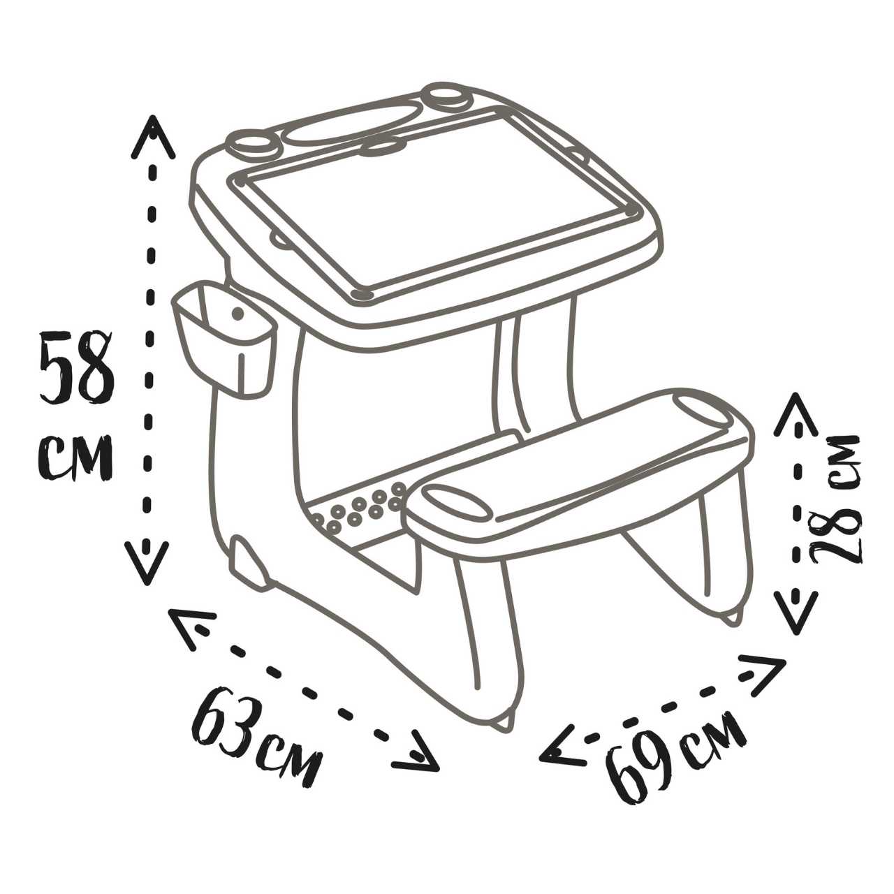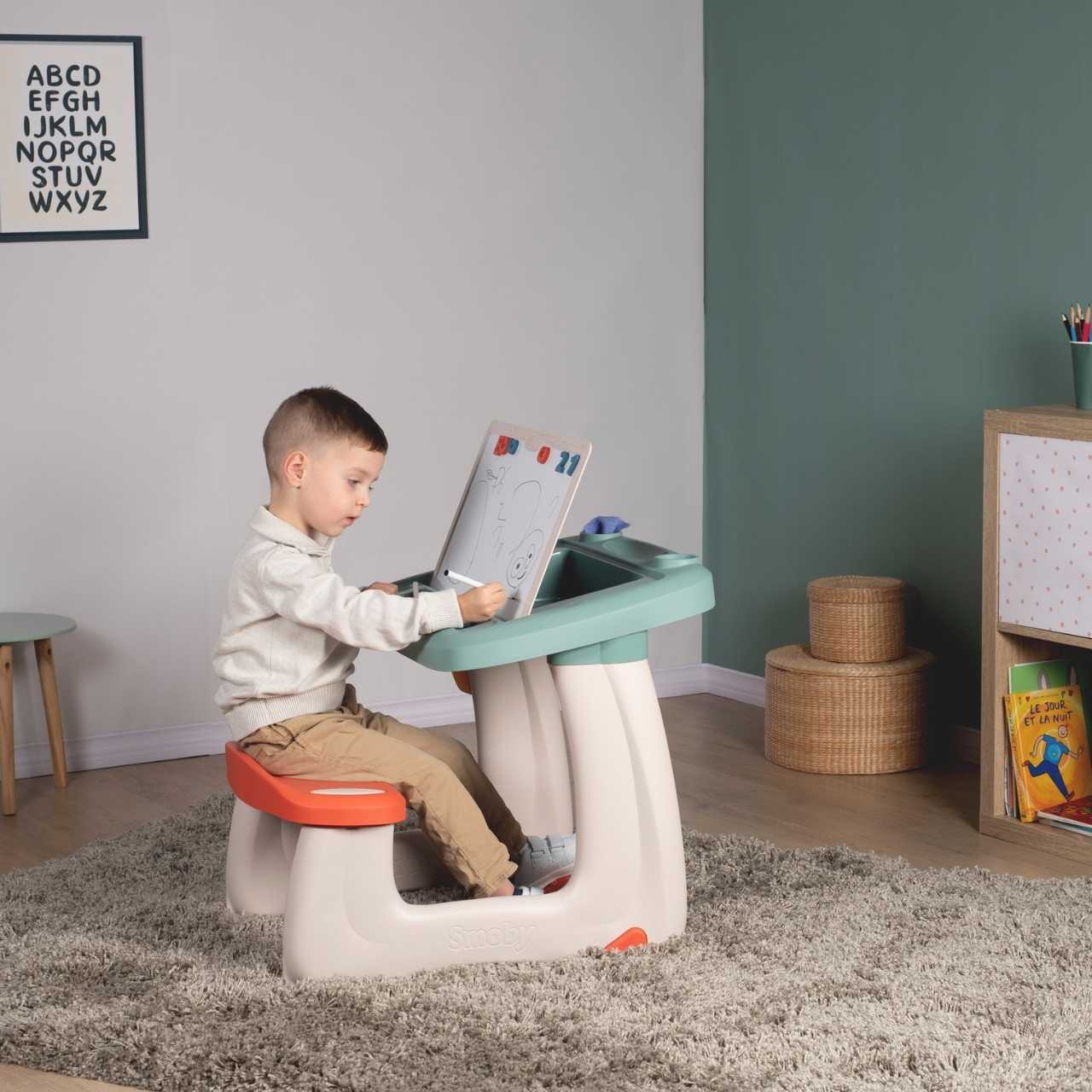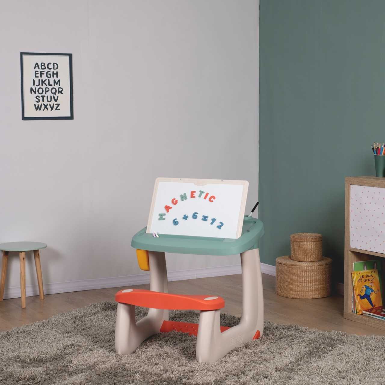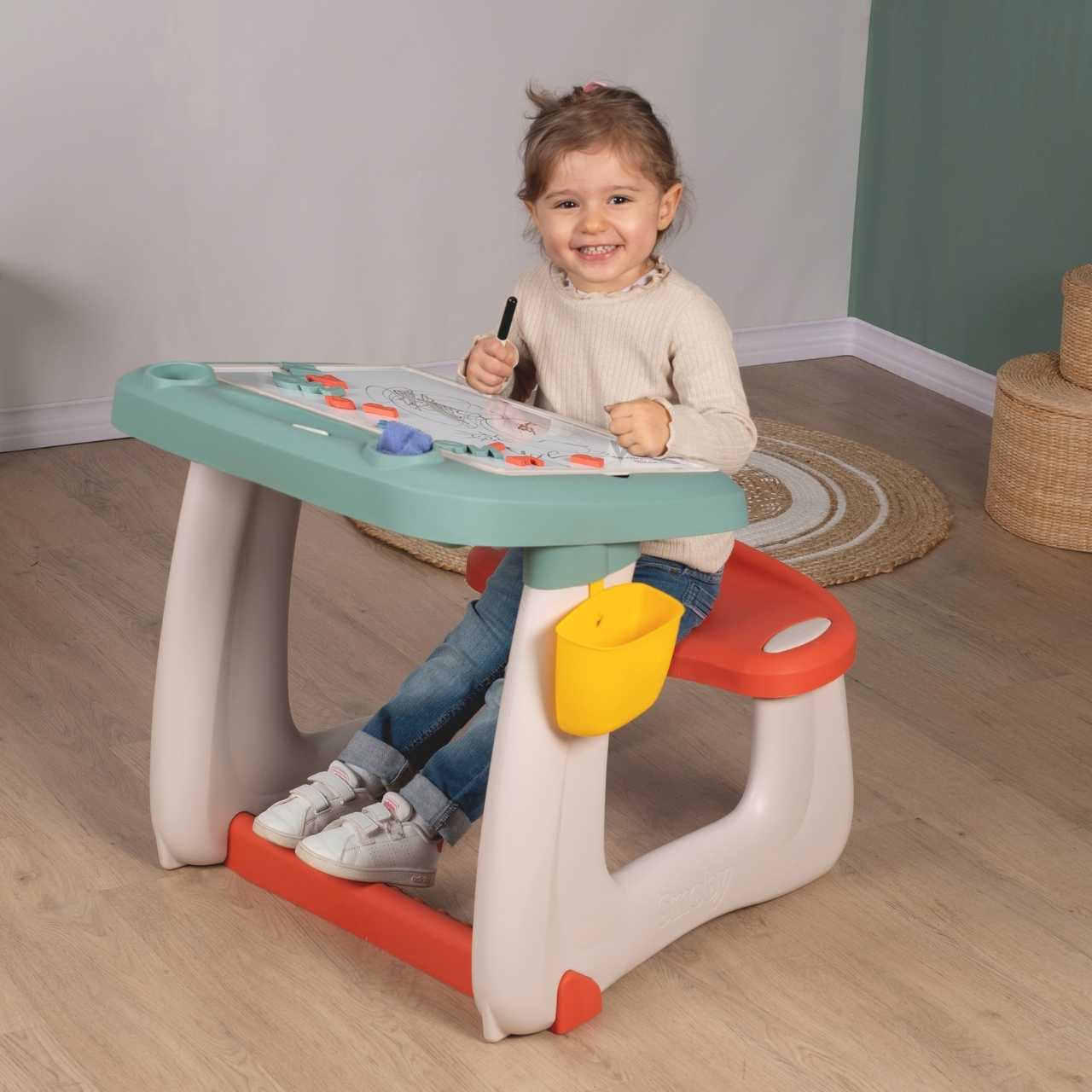 Smoby Çift Taraflı Çalışma Masası, 3 yaş ve üzeri çocuklar için özel olarak tasarlanmış ergonomik ve çok fonksiyonlu bir öğrenme masasıdır. Masanın çift taraflı yüzeyi, siyah tahta kısmı tebeşirle matematik ve yazma egzersizlerine uygunken, beyaz tahta kısmı suda çözünebilen kalemlerle boyama ve çizim için idealdir. Çocukların yaratıcılığını ve öğrenme becerilerini destekleyen bu masa, entegre tezgah, ayak dayanağı ve çıkarılabilir tahta gibi özelliklere sahiptir. Smoby Çift Taraflı Çalışma Masası, çocukların hem eğlenerek öğrenmelerini sağlar hem de yaratıcı oyunları destekler.
