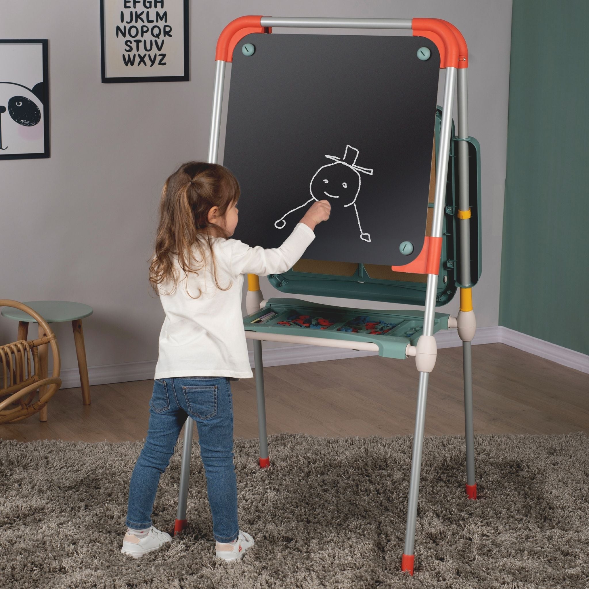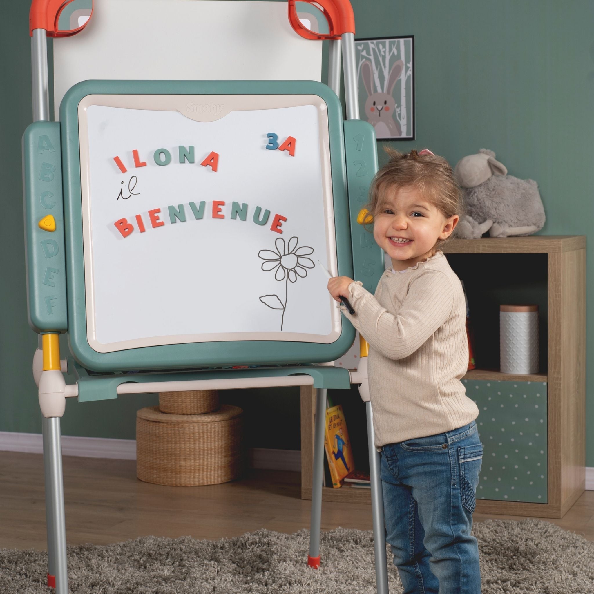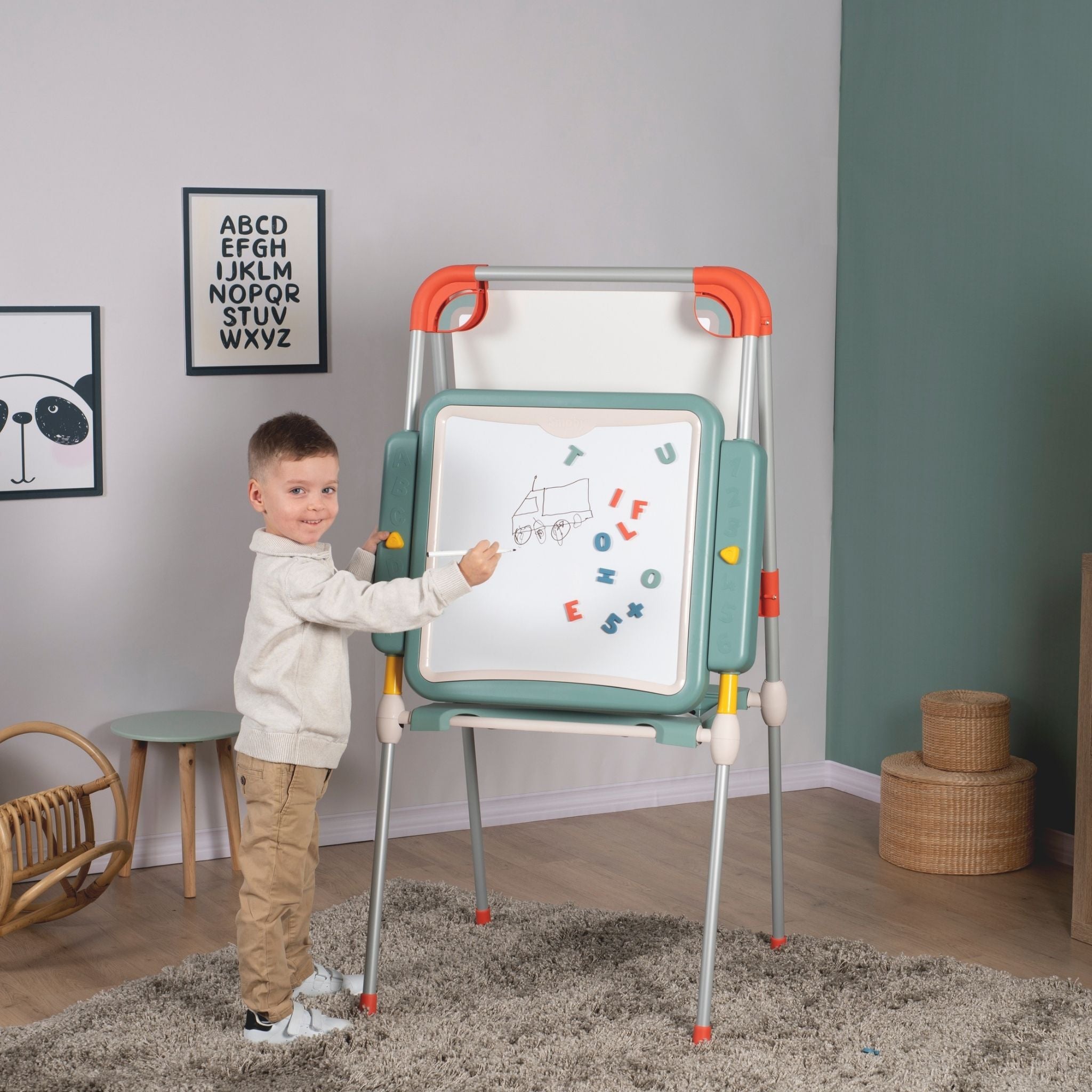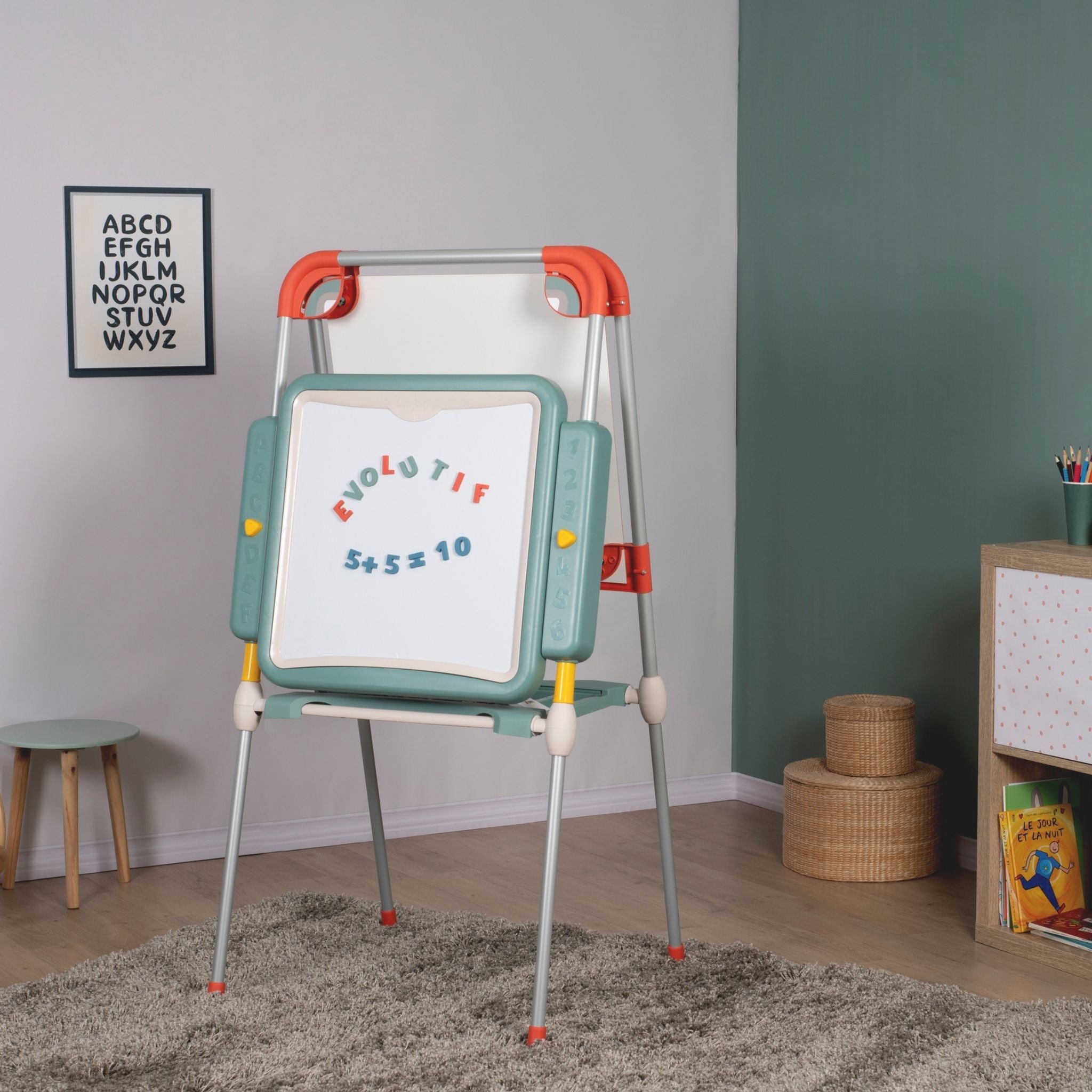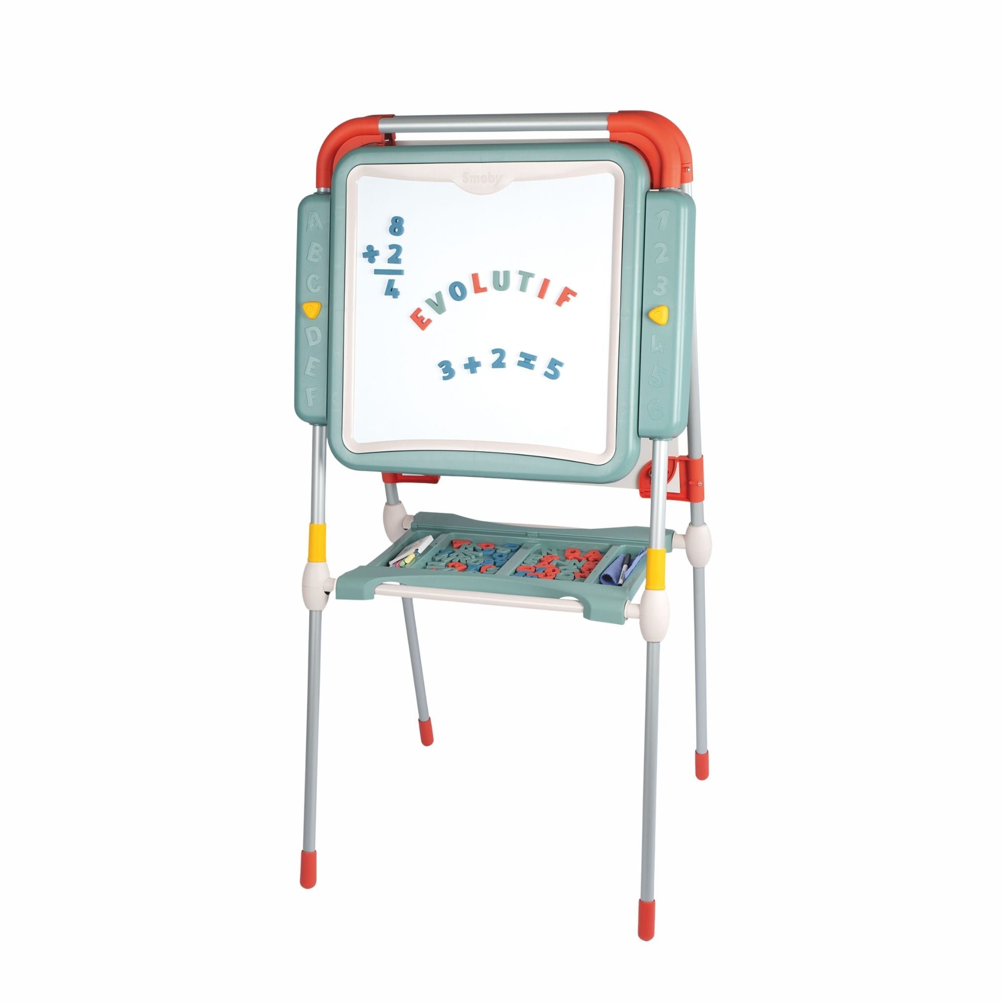 Smoby’nin modern tasarımlı ve fonksiyonel Evrimsel Oyun Tahtası, çocukların öğrenme ve yaratıcılık becerilerini destekleyen harika bir eğitim aracıdır. Yüksekliği ayarlanabilir yapısı sayesinde farklı yaş gruplarına uyum sağlar ve çocuklarla birlikte “büyüyen” bir tahtadır. Bir yüzü manyetik beyaz tahta, diğer yüzü ise geniş sabit aktivite alanı olarak kullanılabilir. Çocuklar manyetik harf ve rakamlarla kelimeler ve sayılar oluşturabilir, silinebilir kalemle yazı yazabilir veya renkli tebeşirlerle özgürce resim yapabilir. Tahta, katlanabilir tasarımı sayesinde kolayca toparlanır ve yer tasarrufu sağlar. Ayrıca, çift bölmeli saklama alanı, kalem, tebeşir ve diğer aksesuarları düzenli bir şekilde muhafaza etmek için idealdir. Fransa’da yüksek kaliteli malzemelerden üretilen Smoby Evrimsel Oyun Tahtası, sağlamlığı ve uzun ömürlü kullanımıyla dikkat çeker. Smoby Evrimsel Oyun Tahtası, çocuklara hem oyun hem de öğrenme deneyimi sunarak yazı yazmayı, sayıları öğrenmeyi ve hayal gücünü geliştirmeyi eğlenceli hale getirir.