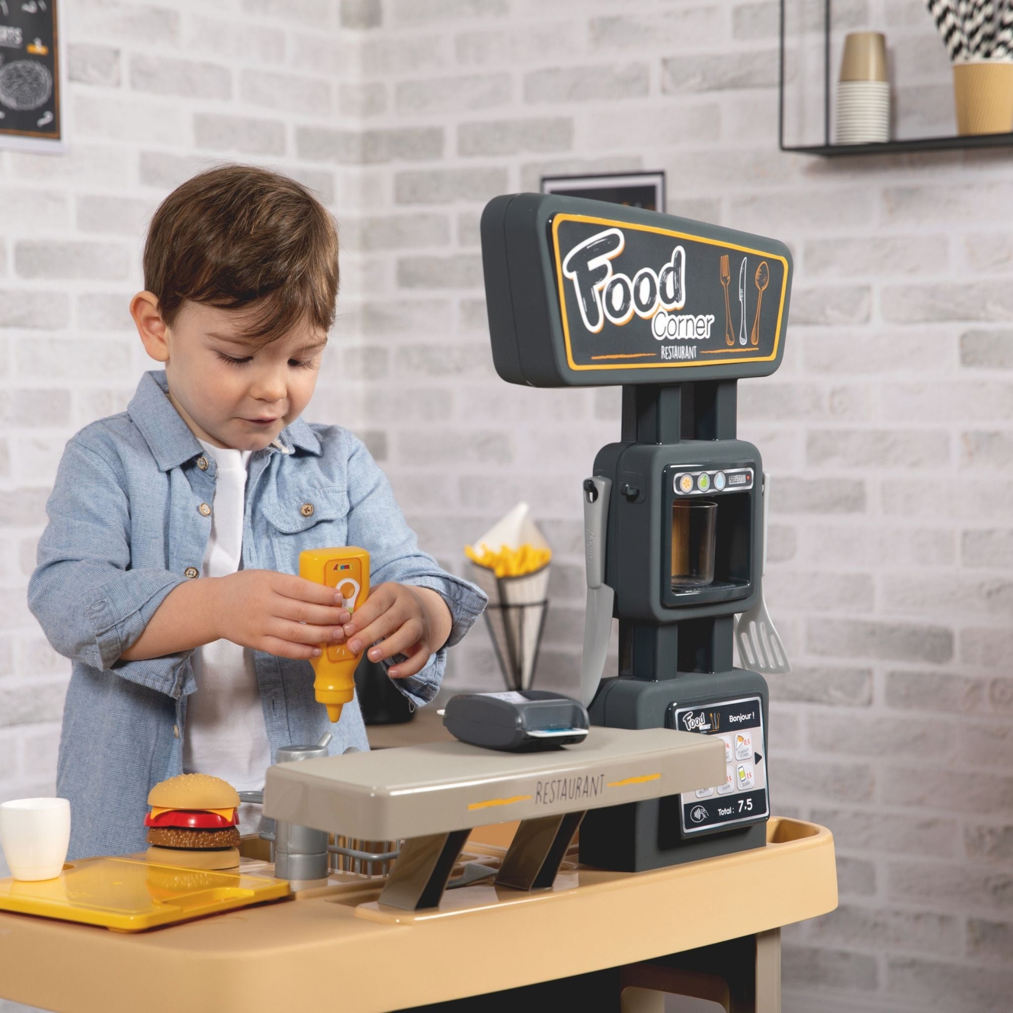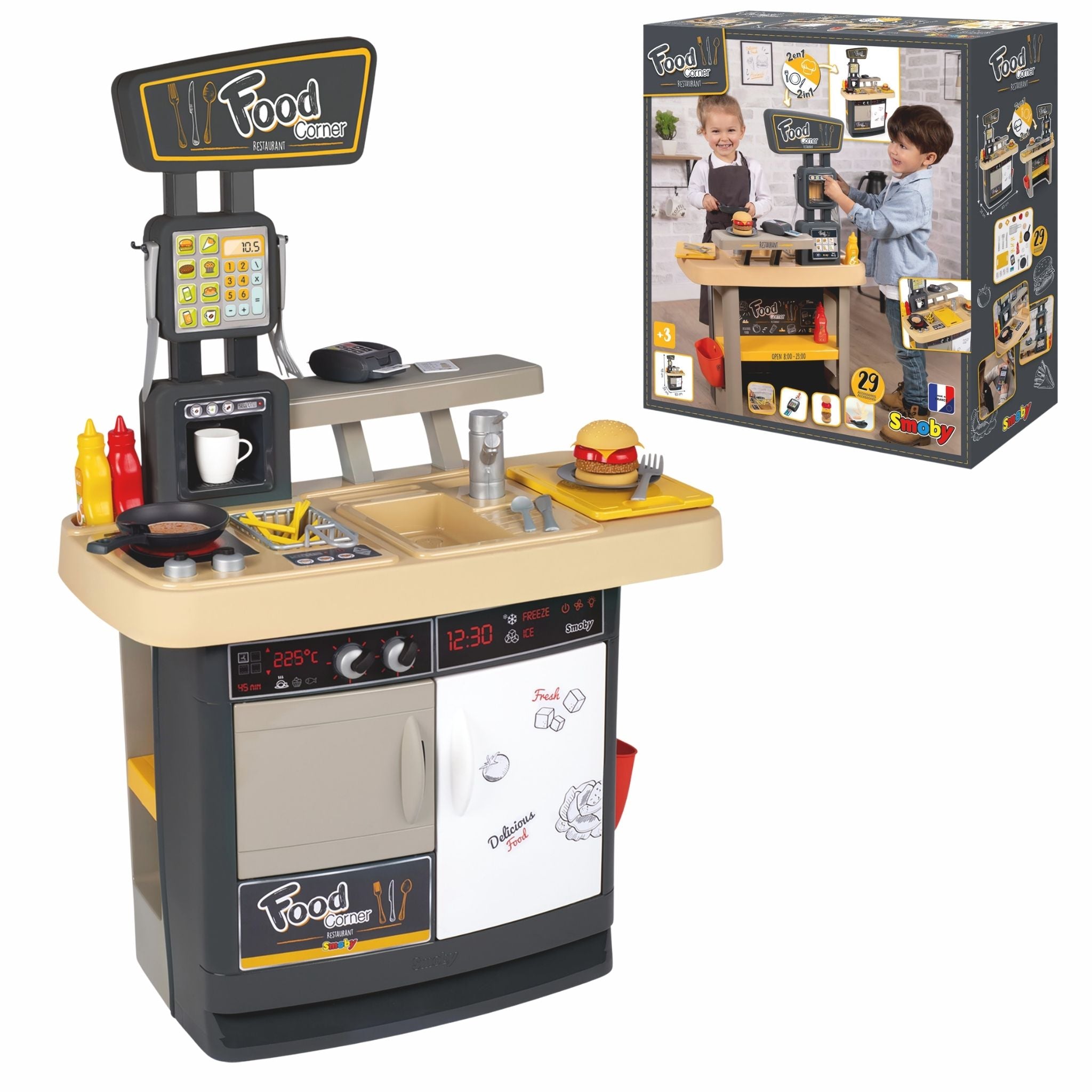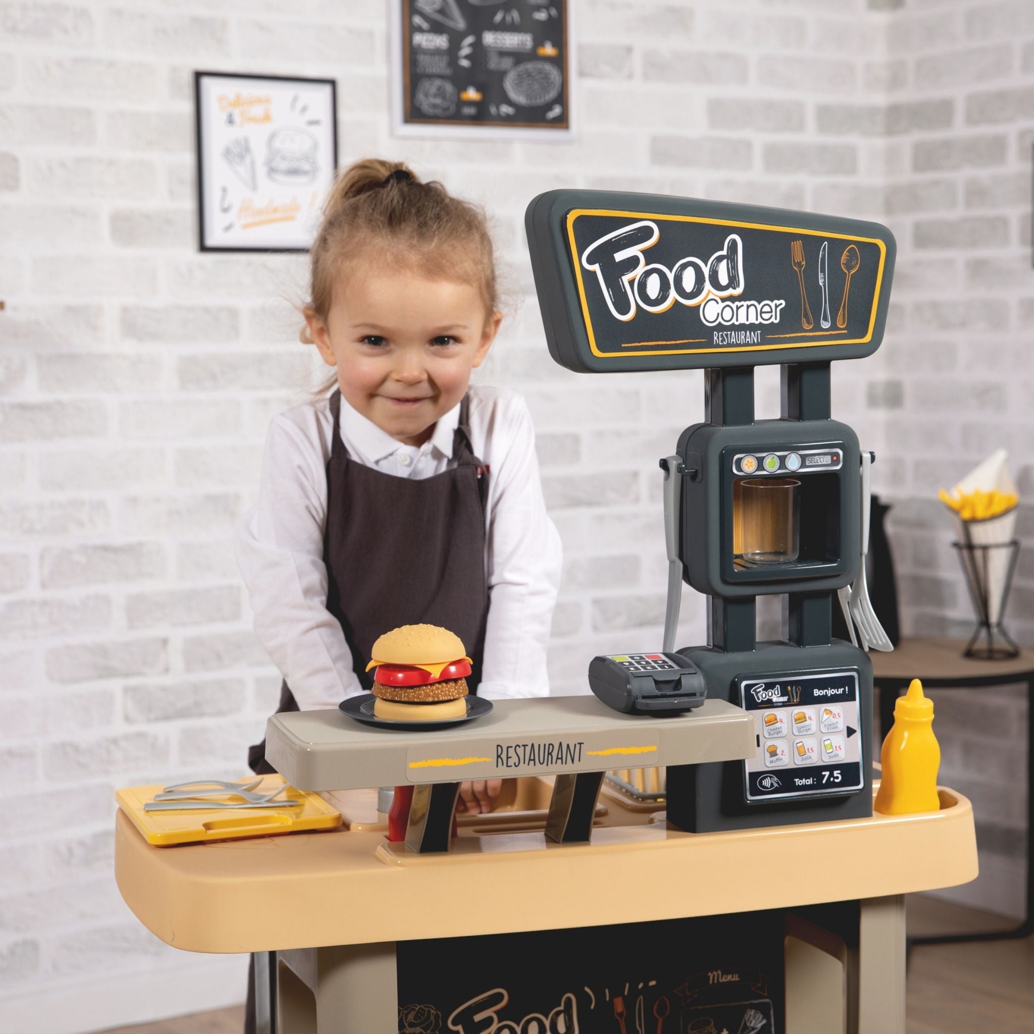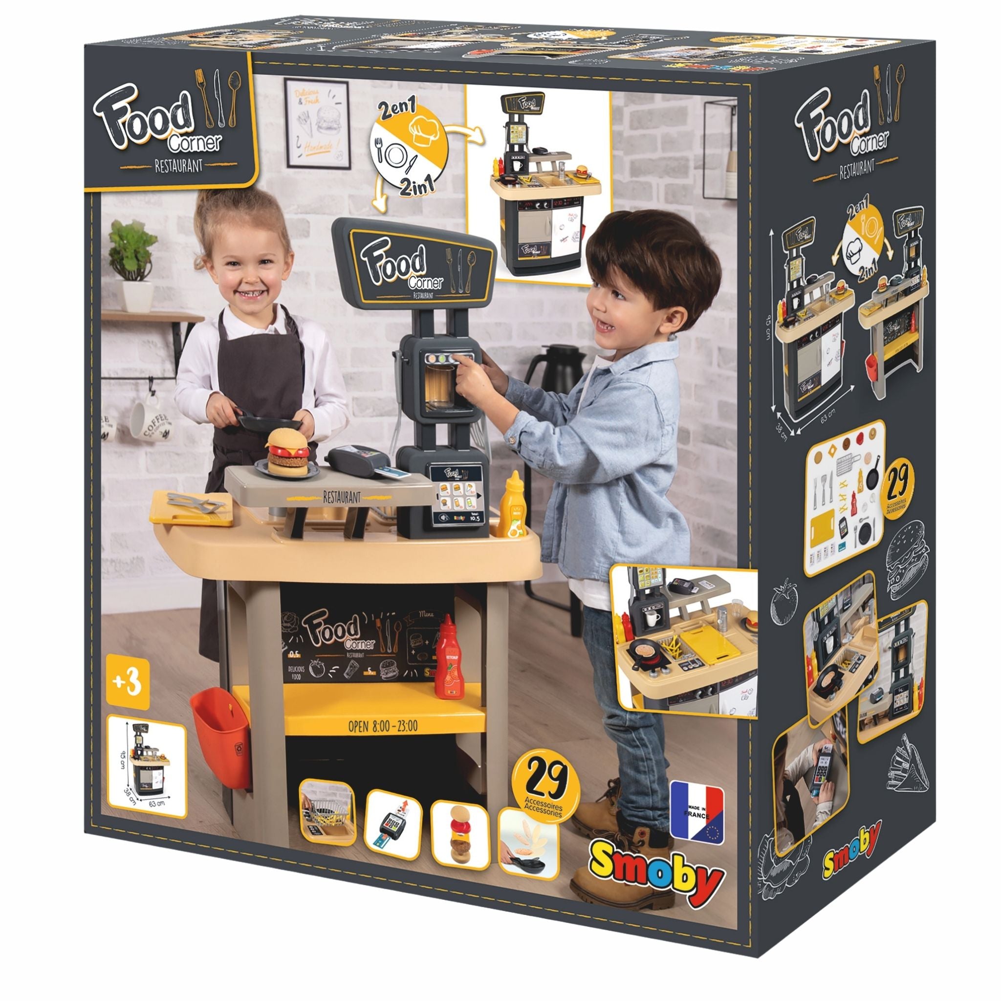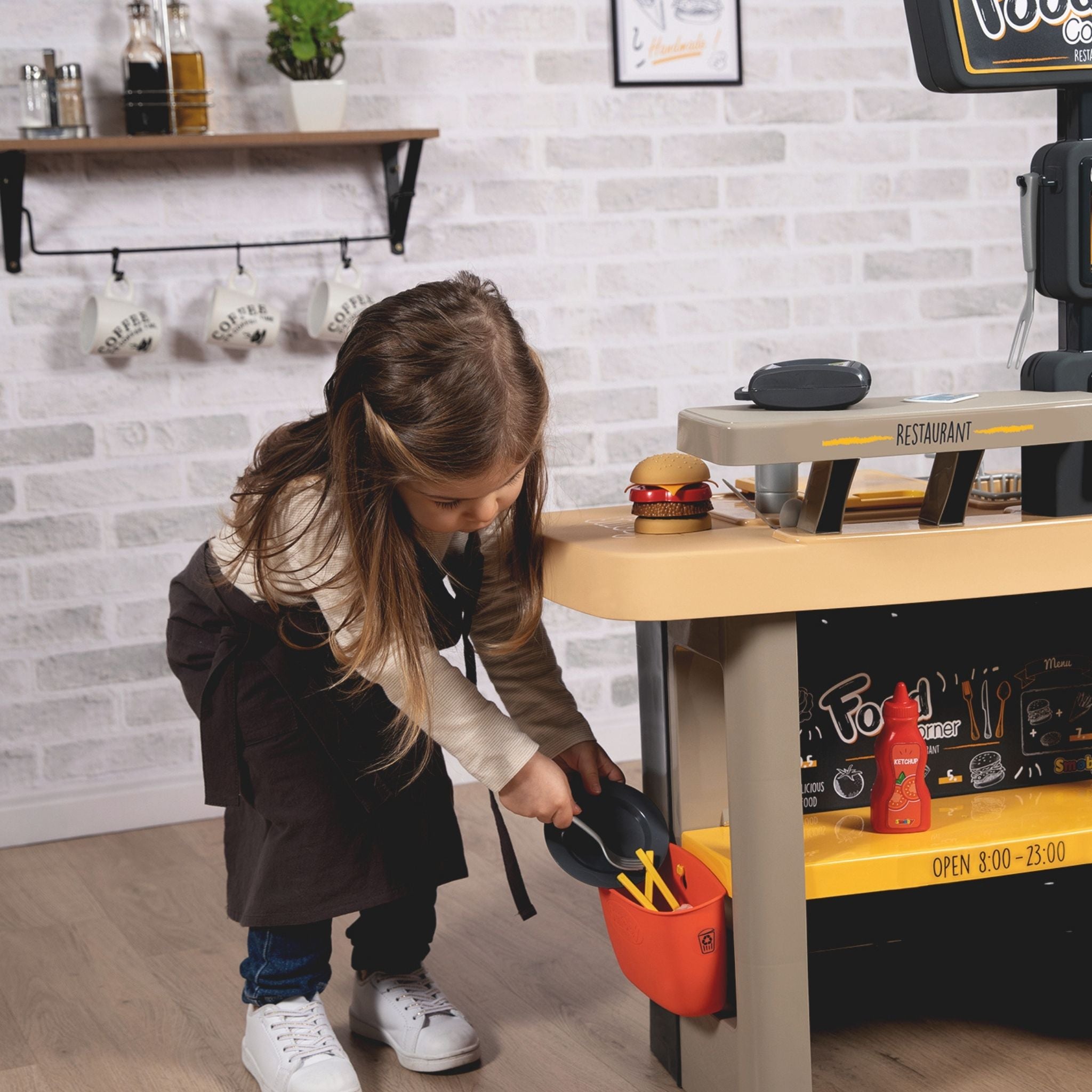 Smoby’nin Köşe Restoran 2 in 1 oyunu, hem oyun mutfağını hem de çocuk restoranını tek bir kompakt yapıda birleştiren özel bir rol yapma setidir. Çocukların hem müşteri alanında sipariş alma hem de arka taraftaki tam donanımlı mutfakta yemek hazırlama deneyimi yaşamasını sağlar. Fonksiyonel tasarımı ve zengin aksesuar içerikleri ile çocukların yaratıcılığını, hayal gücünü, sosyal iletişimini ve motor becerilerini geliştiren eğlenceli bir oyun alanı sunar. Ön bölümde sipariş ekranı, menü ve servis alanı bulunurken; arka bölümde ocak, fritöz, fırın, buzdolabı ve espresso makinesi gibi detaylarla tamamlanmış geniş bir mutfak alanı yer alır. Kreplerin havada döndürülebildiği gözleme tavası gibi etkileşimli oyun aktiviteleri ise oyuna gerçekçilik katar. Set içinde yer alan 29 parça aksesuar, oyun deneyimini daha zengin ve keyifli hale getirir. Dayanıklı malzemelerden üretilmiş olan bu set, uzun süreli kullanım için idealdir.