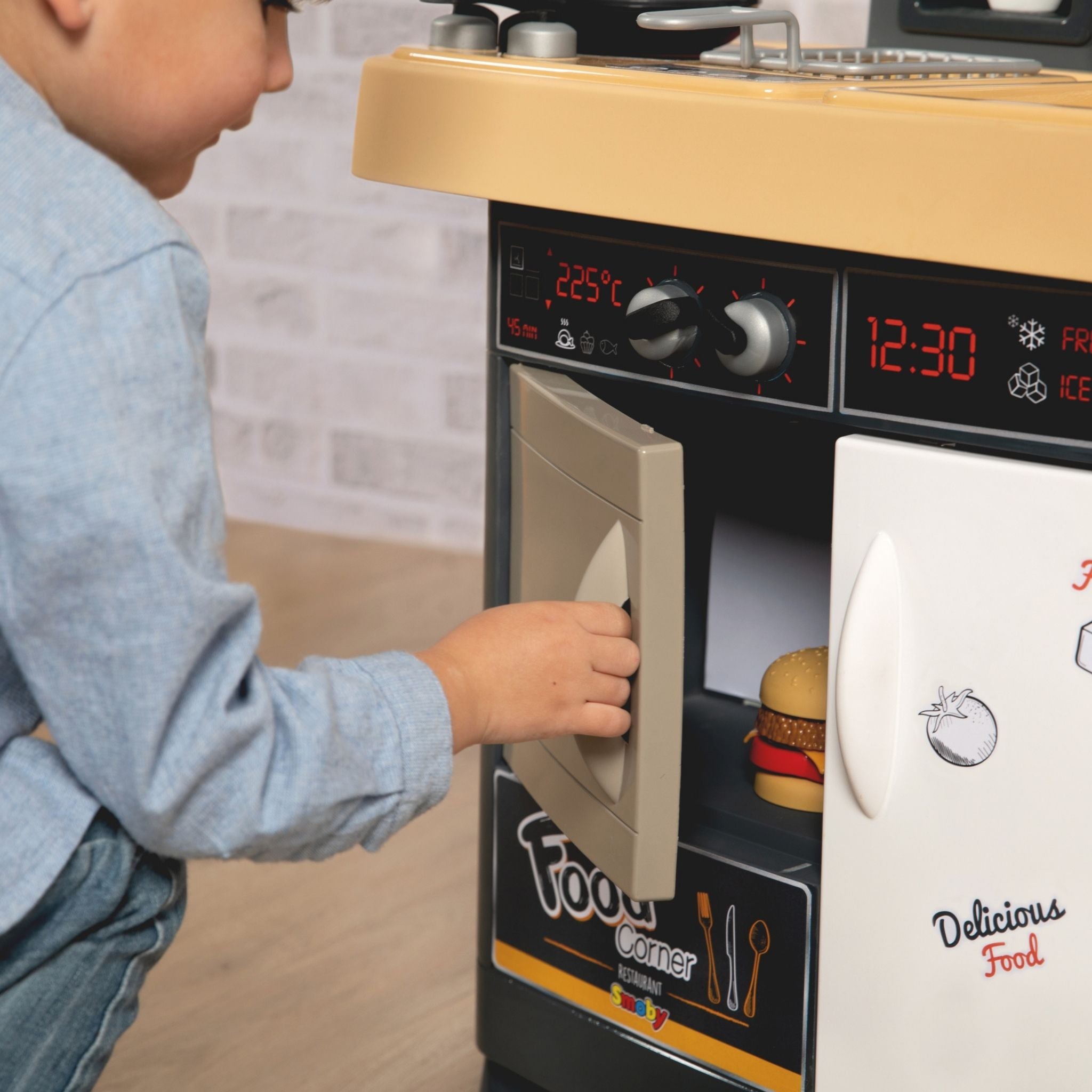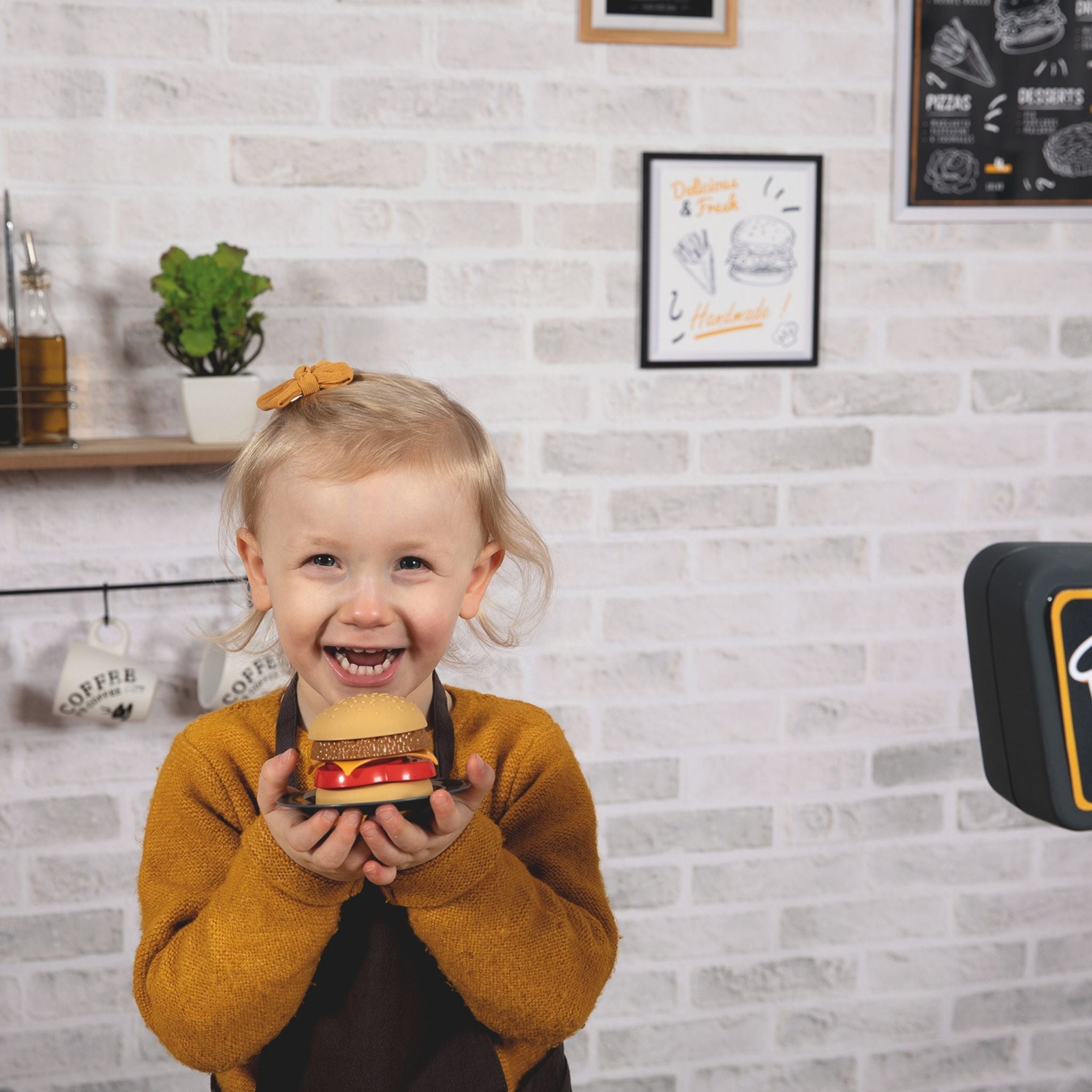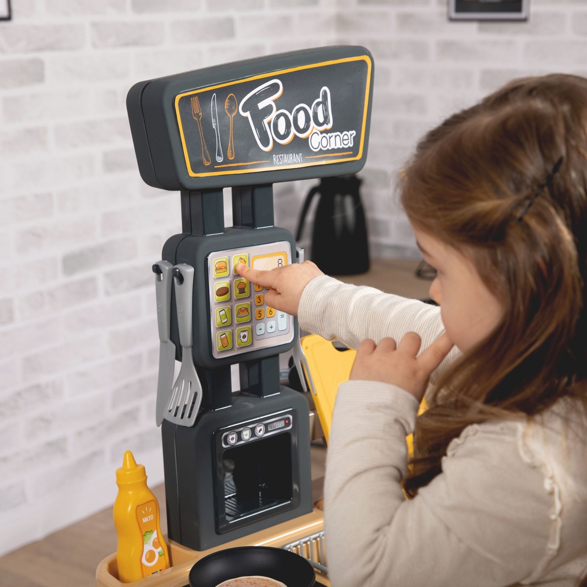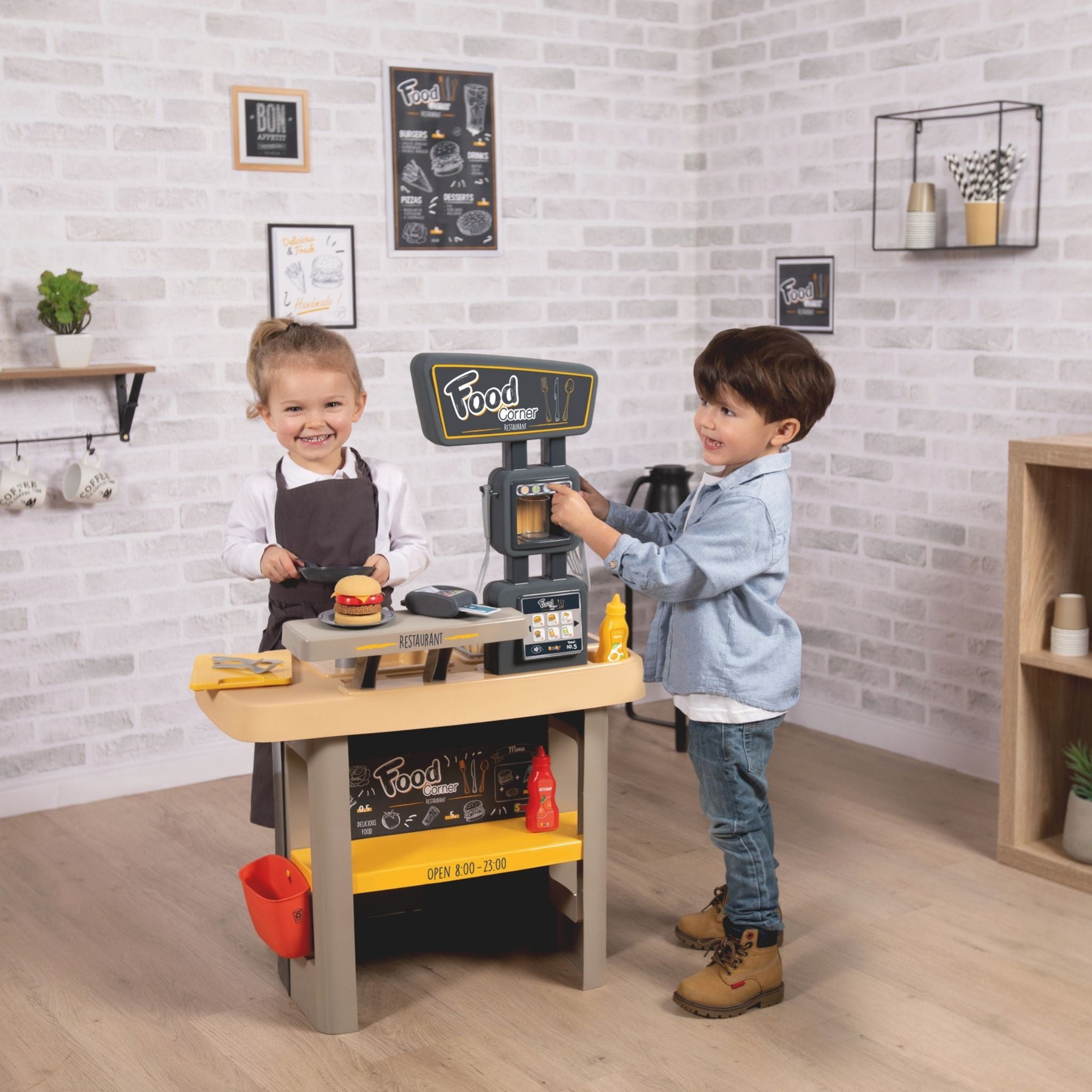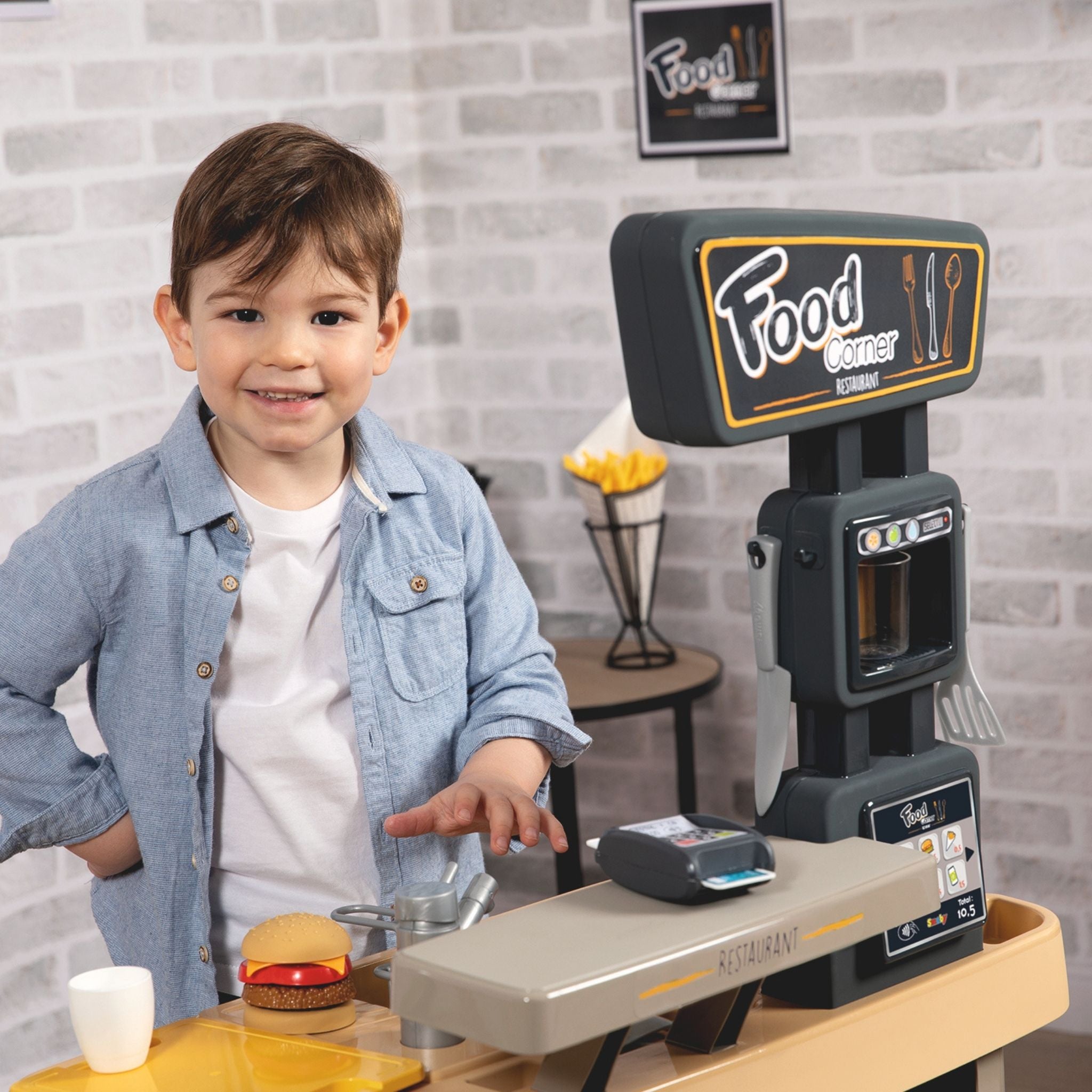 Smoby’nin Köşe Restoran 2 in 1 oyunu, hem oyun mutfağını hem de çocuk restoranını tek bir kompakt yapıda birleştiren özel bir rol yapma setidir. Çocukların hem müşteri alanında sipariş alma hem de arka taraftaki tam donanımlı mutfakta yemek hazırlama deneyimi yaşamasını sağlar. Fonksiyonel tasarımı ve zengin aksesuar içerikleri ile çocukların yaratıcılığını, hayal gücünü, sosyal iletişimini ve motor becerilerini geliştiren eğlenceli bir oyun alanı sunar. Ön bölümde sipariş ekranı, menü ve servis alanı bulunurken; arka bölümde ocak, fritöz, fırın, buzdolabı ve espresso makinesi gibi detaylarla tamamlanmış geniş bir mutfak alanı yer alır. Kreplerin havada döndürülebildiği gözleme tavası gibi etkileşimli oyun aktiviteleri ise oyuna gerçekçilik katar. Set içinde yer alan 29 parça aksesuar, oyun deneyimini daha zengin ve keyifli hale getirir. Dayanıklı malzemelerden üretilmiş olan bu set, uzun süreli kullanım için idealdir.