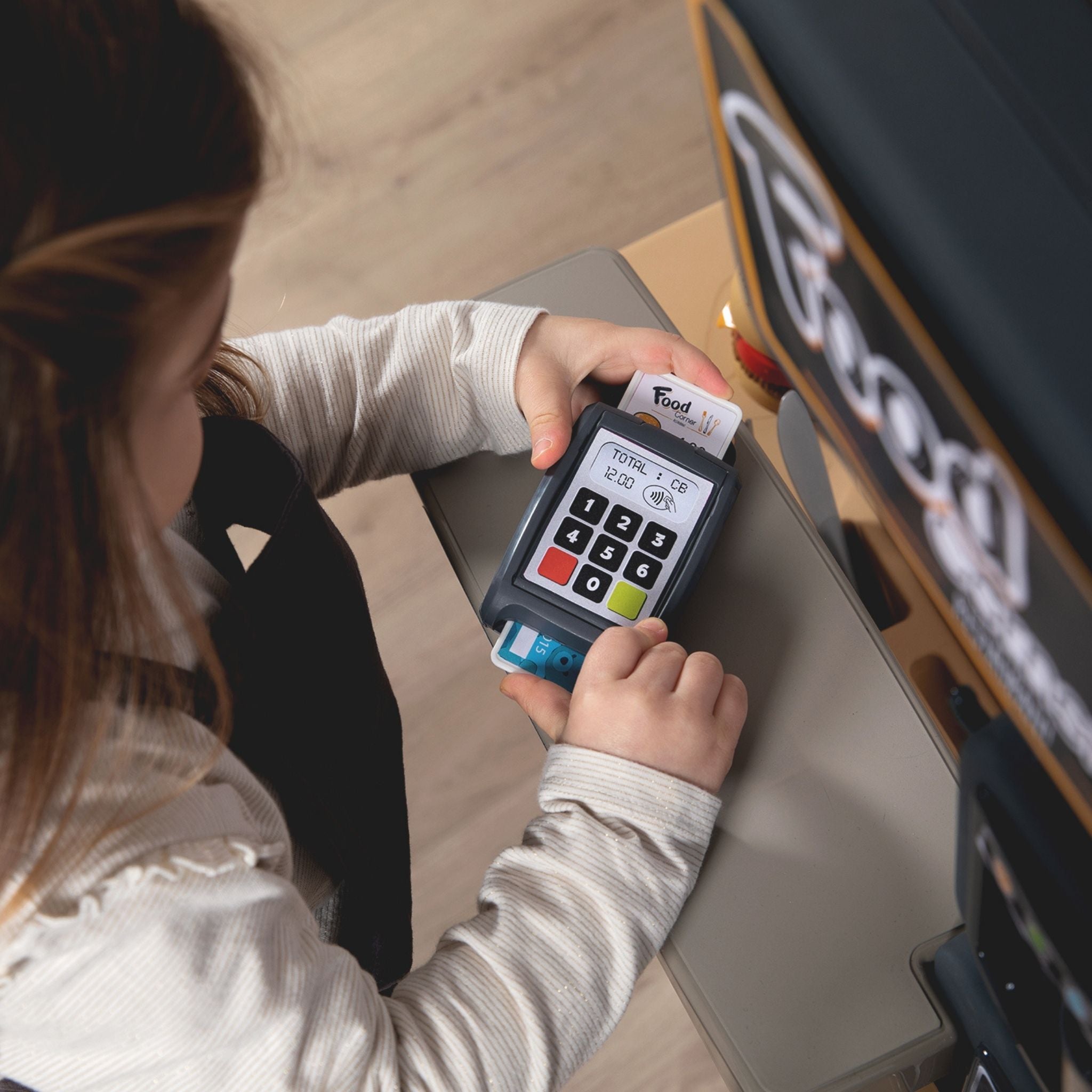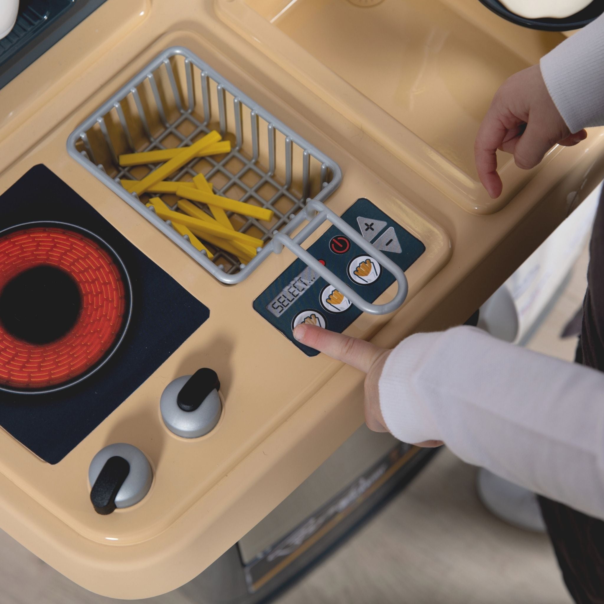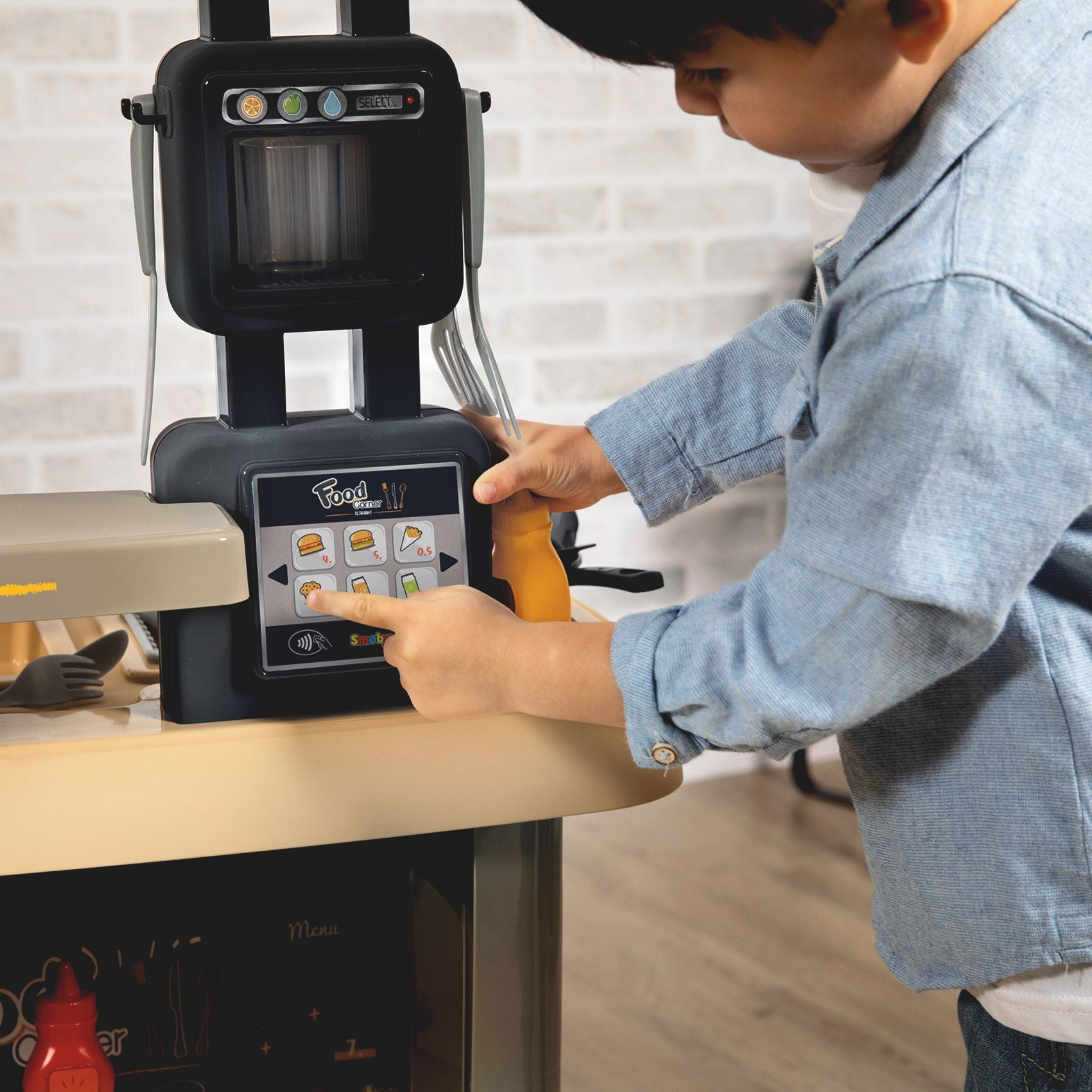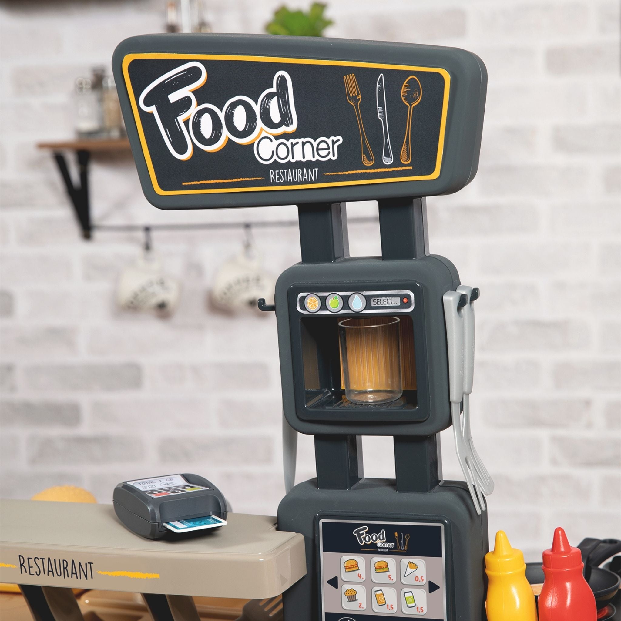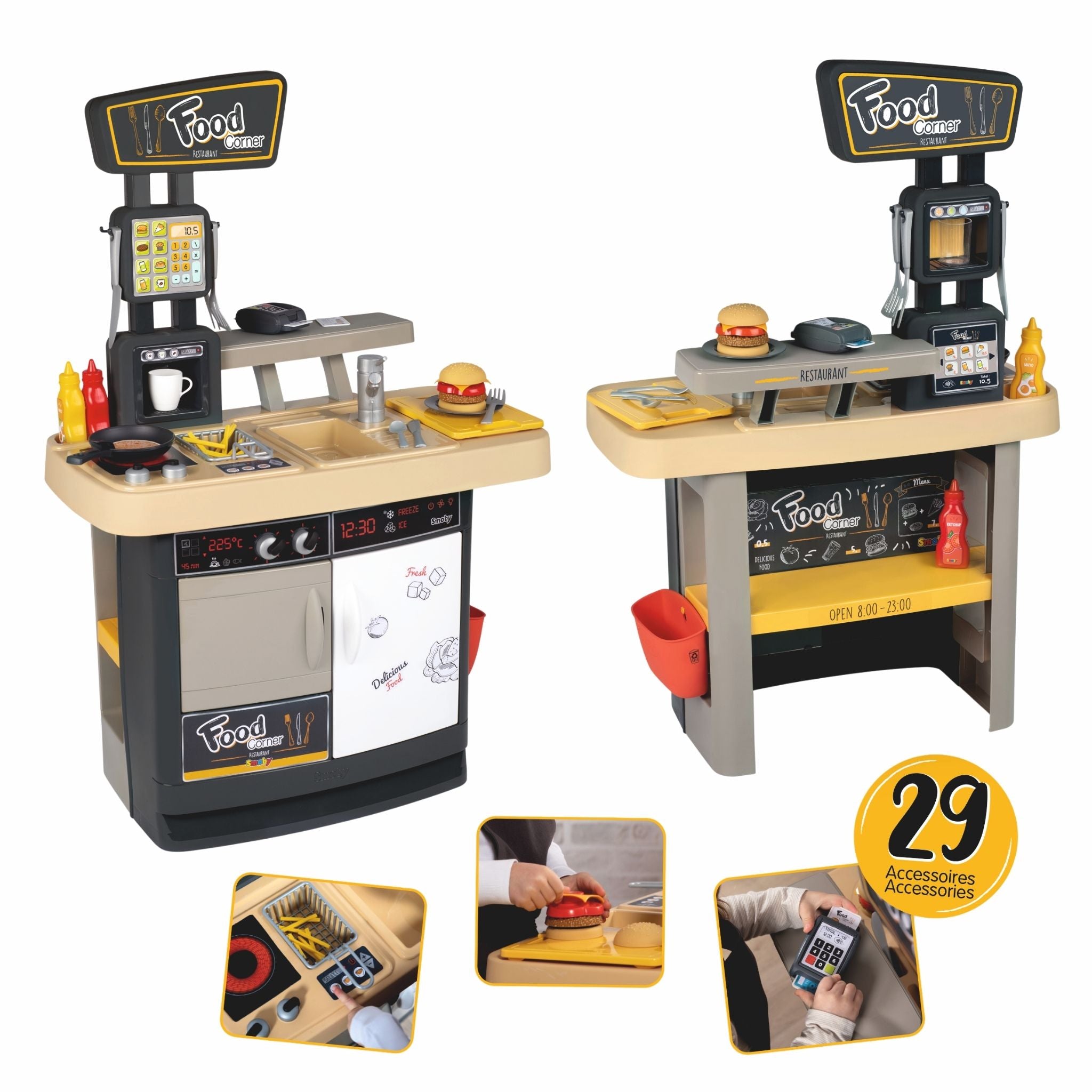 Smoby’nin Köşe Restoran 2 in 1 oyunu, hem oyun mutfağını hem de çocuk restoranını tek bir kompakt yapıda birleştiren özel bir rol yapma setidir. Çocukların hem müşteri alanında sipariş alma hem de arka taraftaki tam donanımlı mutfakta yemek hazırlama deneyimi yaşamasını sağlar. Fonksiyonel tasarımı ve zengin aksesuar içerikleri ile çocukların yaratıcılığını, hayal gücünü, sosyal iletişimini ve motor becerilerini geliştiren eğlenceli bir oyun alanı sunar. Ön bölümde sipariş ekranı, menü ve servis alanı bulunurken; arka bölümde ocak, fritöz, fırın, buzdolabı ve espresso makinesi gibi detaylarla tamamlanmış geniş bir mutfak alanı yer alır. Kreplerin havada döndürülebildiği gözleme tavası gibi etkileşimli oyun aktiviteleri ise oyuna gerçekçilik katar. Set içinde yer alan 29 parça aksesuar, oyun deneyimini daha zengin ve keyifli hale getirir. Dayanıklı malzemelerden üretilmiş olan bu set, uzun süreli kullanım için idealdir.