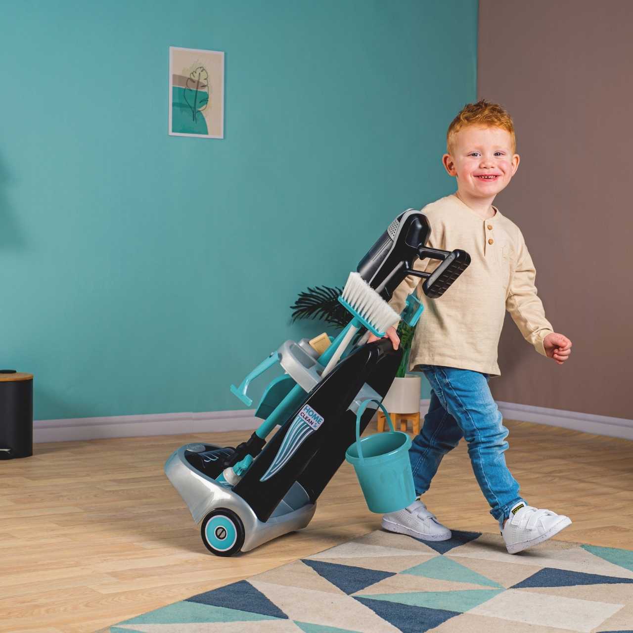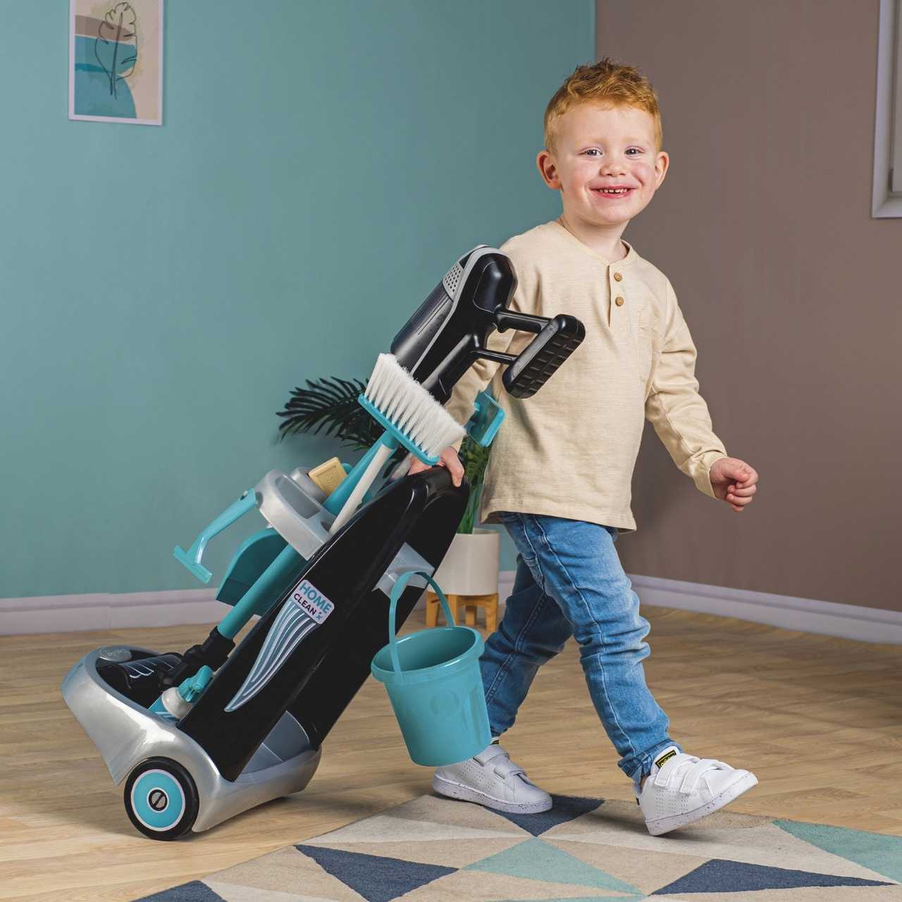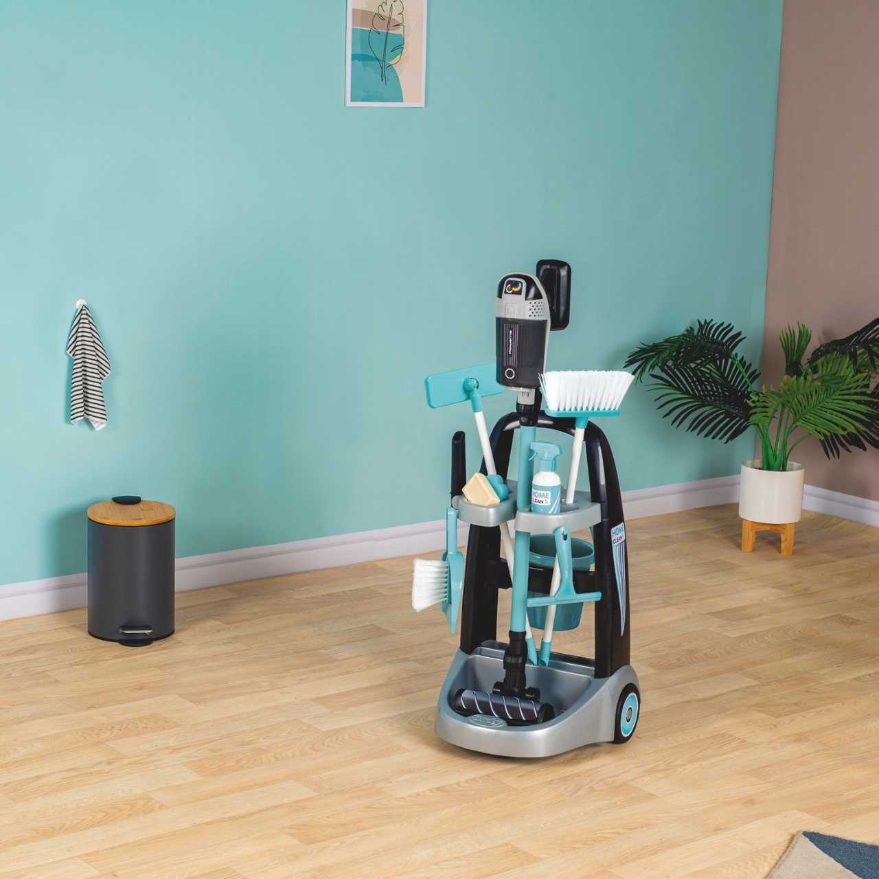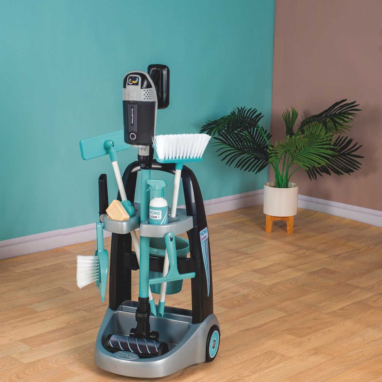 Smoby Rowenta Temizlik Arabası, evcilik oyunlarına yepyeni bir boyut kazandırarak çocuklara gerçek temizlik deneyimini eğlenceli bir şekilde sunar. Gerçek Rowenta X Force Flex modelinden esinlenerek tasarlanmış kablosuz oyuncak elektrikli süpürgesiyle çocuklar, temizlik yapma oyunlarına daha fazla ilgi gösterir. Tek tuşla çalışan süpürge, gerçek emiş sesi çıkararak gerçekçiliği artırır. Üstelik süpürge uzun sapı çıkarılarak el tipi kullanım imkanı da sunar ve yanında ek bir başlıkla birlikte gelir. Temizlik arabası seti, yalnızca süpürgeyle sınırlı kalmaz; süpürge, fırça, tozpan, paspas, sprey şişesi, sabun şişesi, sünger, kova ve cam temizleyici gibi zengin aksesuarlarla donatılmıştır. Bu detaylar sayesinde çocuklar, evdeki temizlik rutinini taklit ederek hem eğlenir hem de sorumluluk bilinci kazanır. Hem bireysel hem de grup oyunları için uygun olan bu set, sosyal becerilerin gelişimine katkı sağlar. Dayanıklı yapısı ve kaliteli malzemeleri ile uzun süreli kullanım sunar.