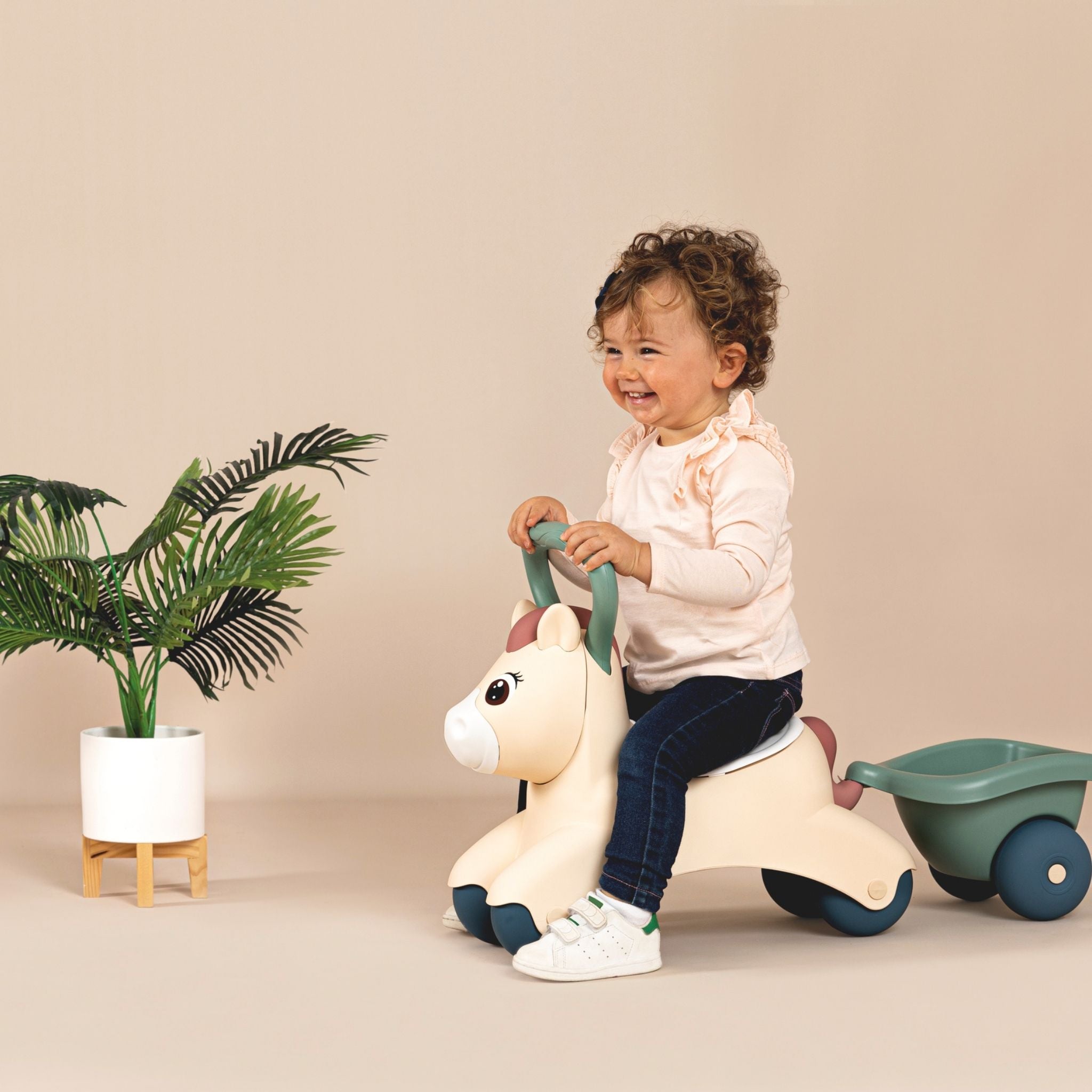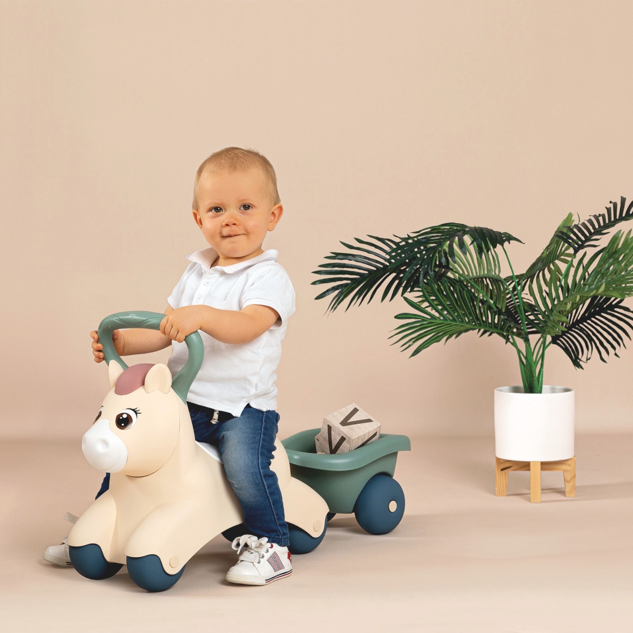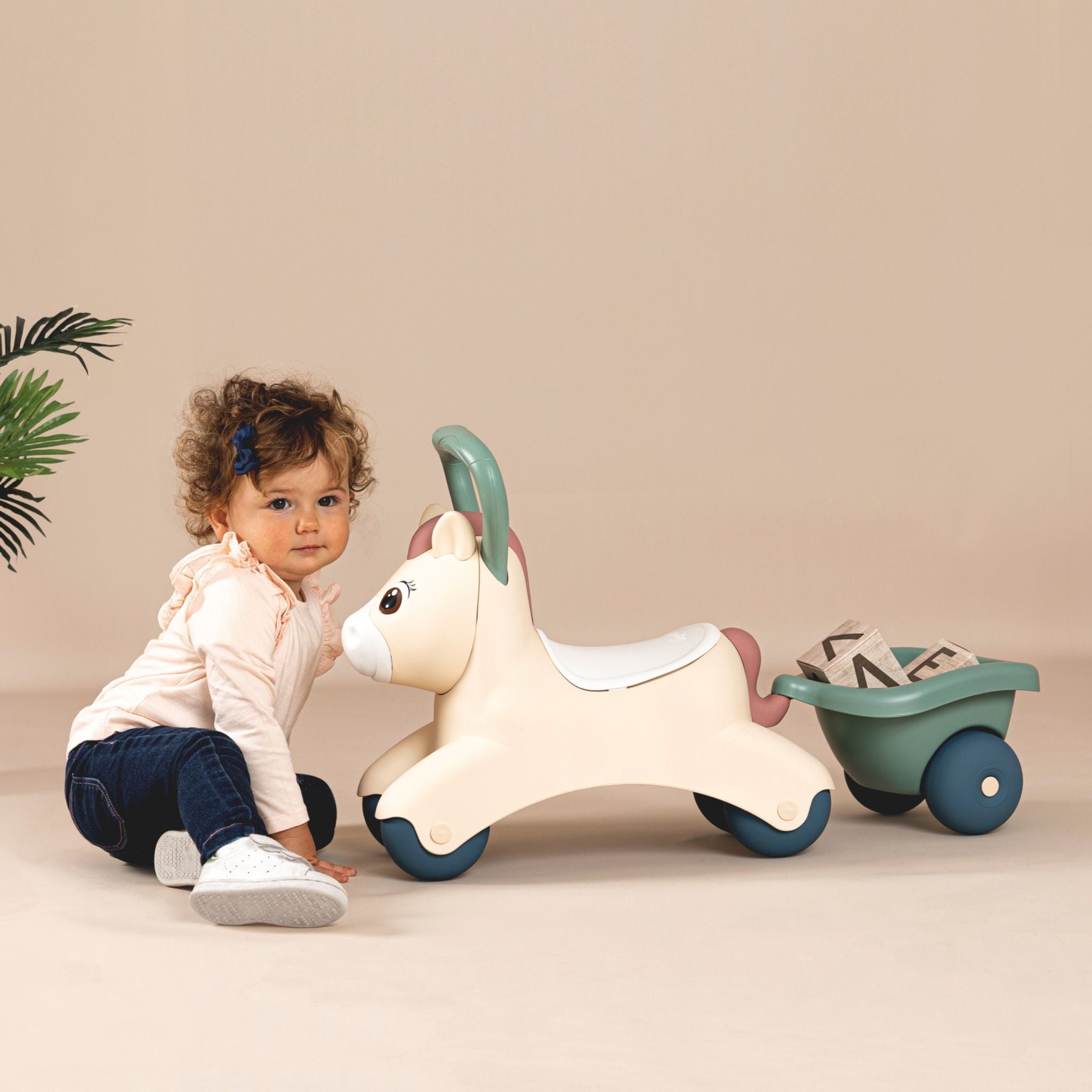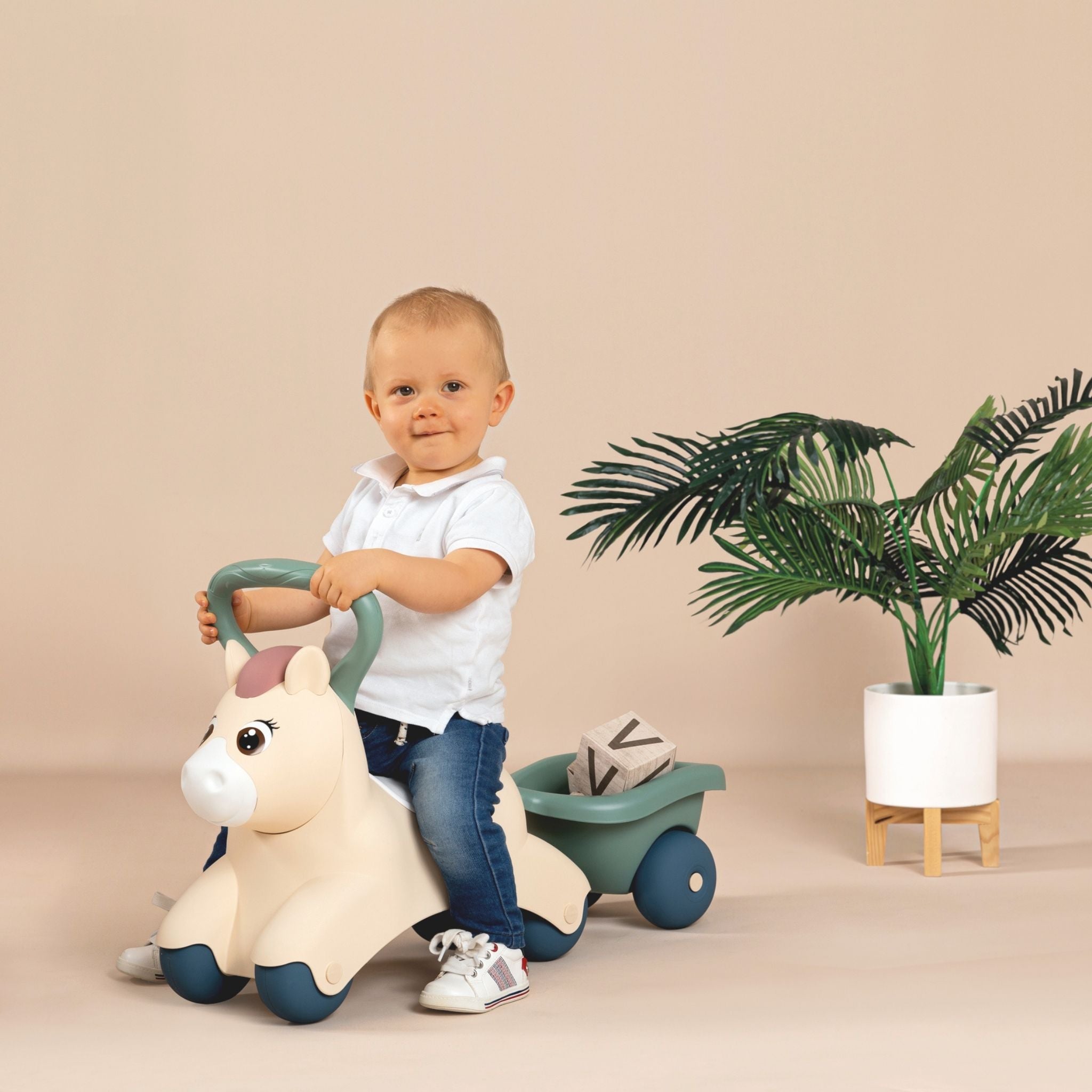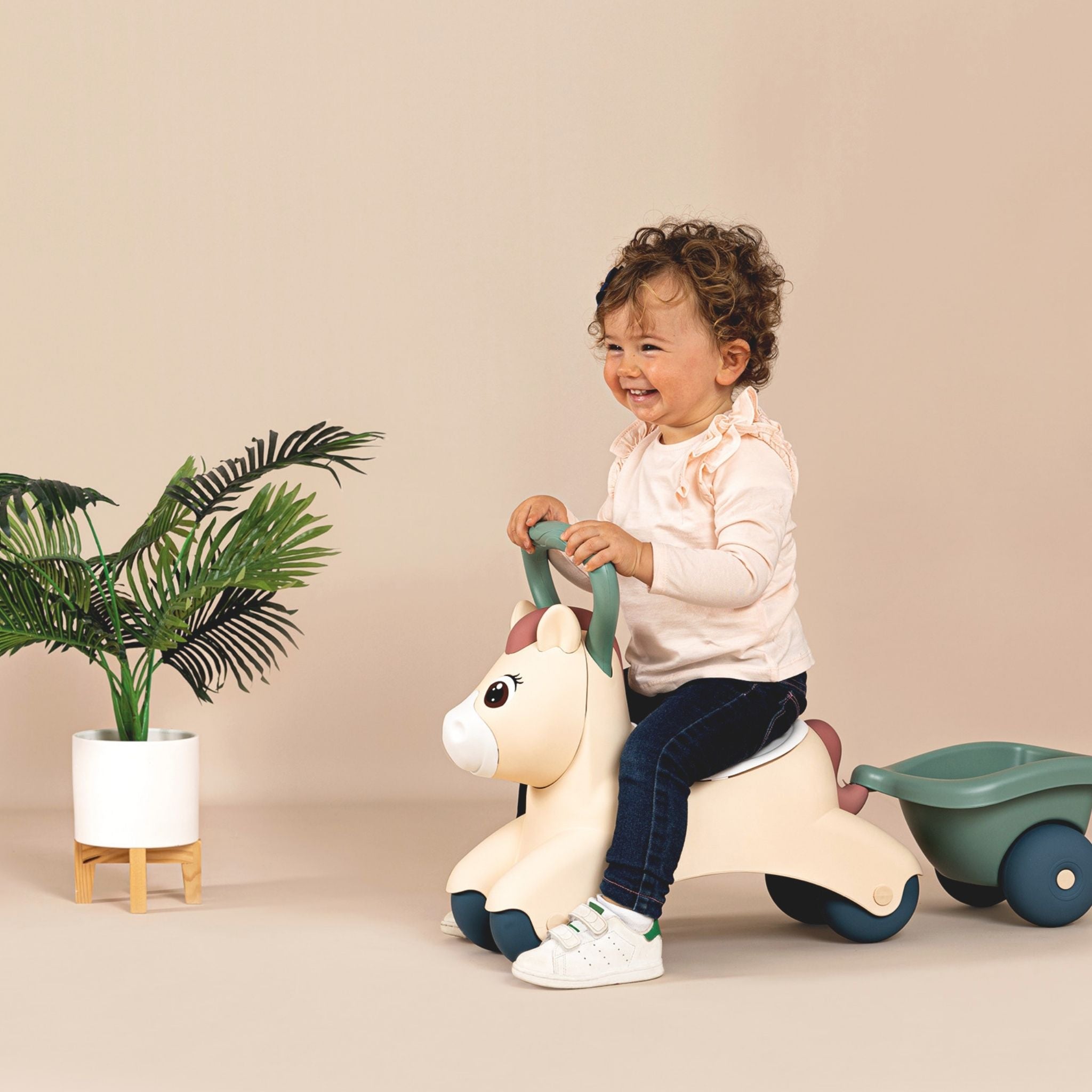 Little Smoby Bebek Midilli Bingit Araç, yürümeye başlayan miniklere ilk sürüş deneyimini güvenli, eğlenceli ve ergonomik bir şekilde sunmak için tasarlanmış sevimli bir binit araçtır. Midilli formundaki şirin tasarım, çocukların dikkatini çekerken aynı zamanda oyunlarını daha eğlenceli hale getirir. Hafif gövdesi ve kompakt yapısı sayesinde bebekler tarafından kolayca kontrol edilebilir ve rahatça yönlendirilebilir. Baş kısmında yer alan ergonomik tutma alanı, hem miniklerin aracı güvenli şekilde sürmesine yardımcı olur hem de ebeveynler için pratik bir taşıma sapı görevi görür. Ürüne dahil olan küçük römork, çocukların en sevdiği oyuncakları yanına alarak hayal gücünü geliştirecek oyunlar kurmasına imkan tanır. Düşük ağırlığı sayesinde hızlı manevra yapılabilir; sağlam yapısı sayesinde güvenle kullanılabilir. Fransa’da yüksek kalite standartlarına uygun malzemelerle üretilmiştir.