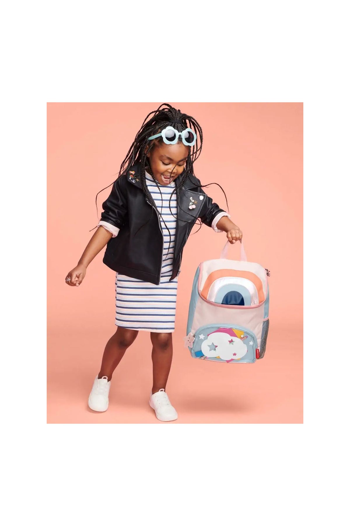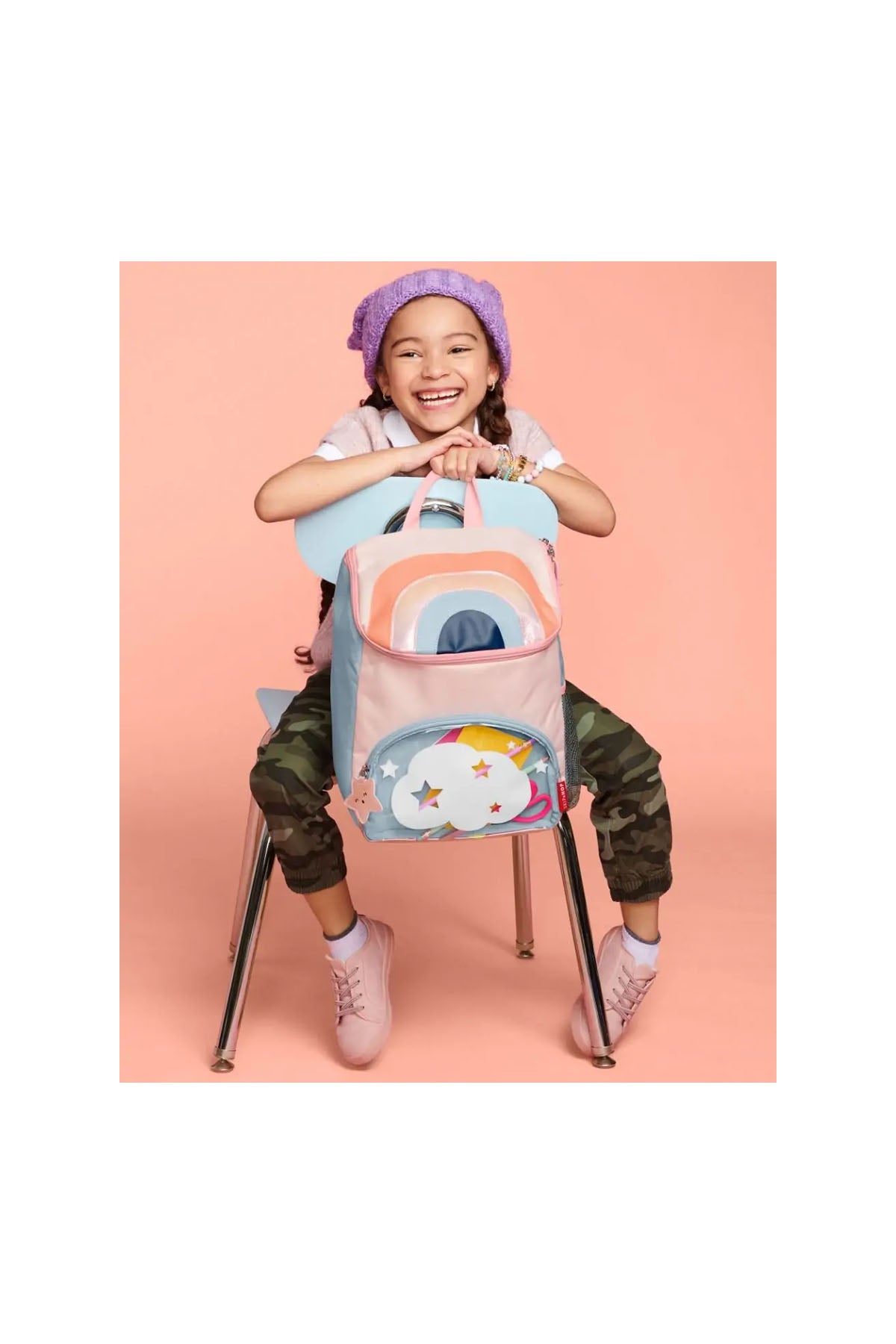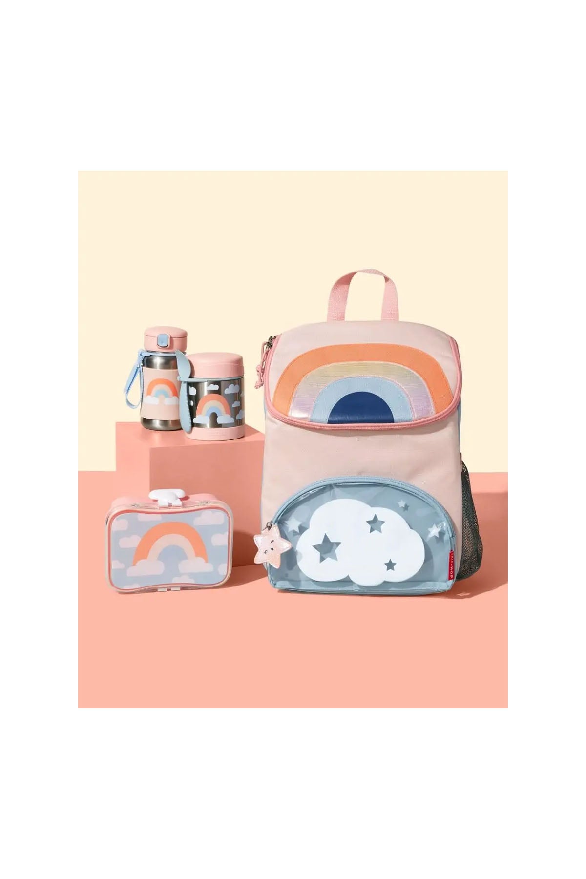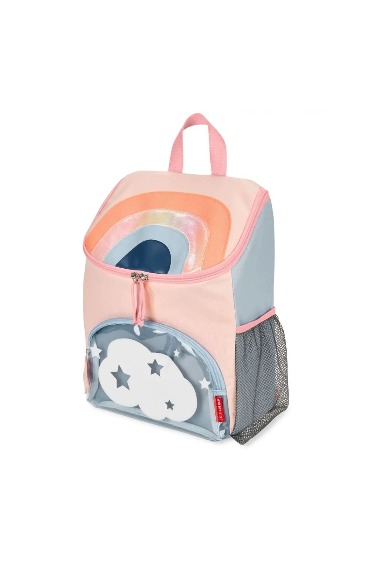 Skip Hop Spark Style Gökkuşağı sırt çantası, enerjik tasarımı ve fonksiyonel yapısıyla çocukların okul ve günlük yaşamına renk katıyor. Gökkuşağı temalı canlı deseni, küçük kullanıcıların tarzını yansıtırken, geniş iç hacmi sayesinde kitap, defter, kalem kutusu ve beslenme çantası gibi birçok eşyayı düzenli bir şekilde taşımaya imkân tanır. Üç yaş ve üzeri çocuklara uygun ölçüde tasarlanan bu büyük boy çanta; okul klasörleri için yeterli alana sahip olup, gün boyu ihtiyaç duyulabilecek tüm malzemeleri organize edecek bölmelere sahiptir. Şeffaf fermuarlı ön cep, miniklerin kolay erişebileceği alan sunarken; yan taraftaki elastik file cep, suluk ve matara için idealdir. Ayarlanabilir pamuklu askıları ve üst taşıma kolu sayesinde hem taşıması hem de kullanımı son derece rahattır.