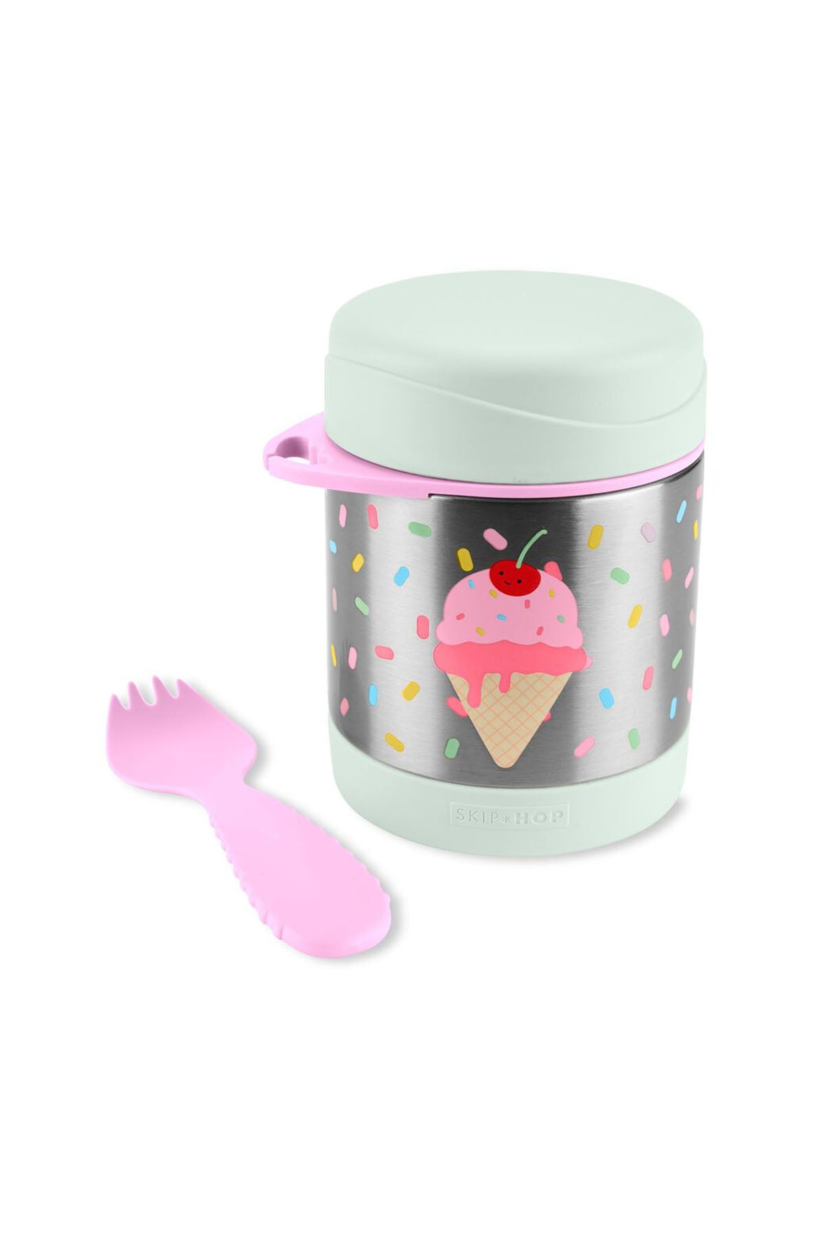 Skip Hop Spark Style Paslanmaz Çelik Termos Dondurma modeli, eğlenceli tasarımı ve yüksek performanslı yalıtımıyla çocukların yemek saatlerini daha keyifli hale getirir. Hem çorba hem de meyve gibi yiyecekleri taşımak için ideal olan bu termos, paslanmaz çelik yapısı sayesinde yiyecekleri uzun süre sıcak veya soğuk tutar. Renkli dondurma temasıyla çocukların severek kullanacağı bir üründür.