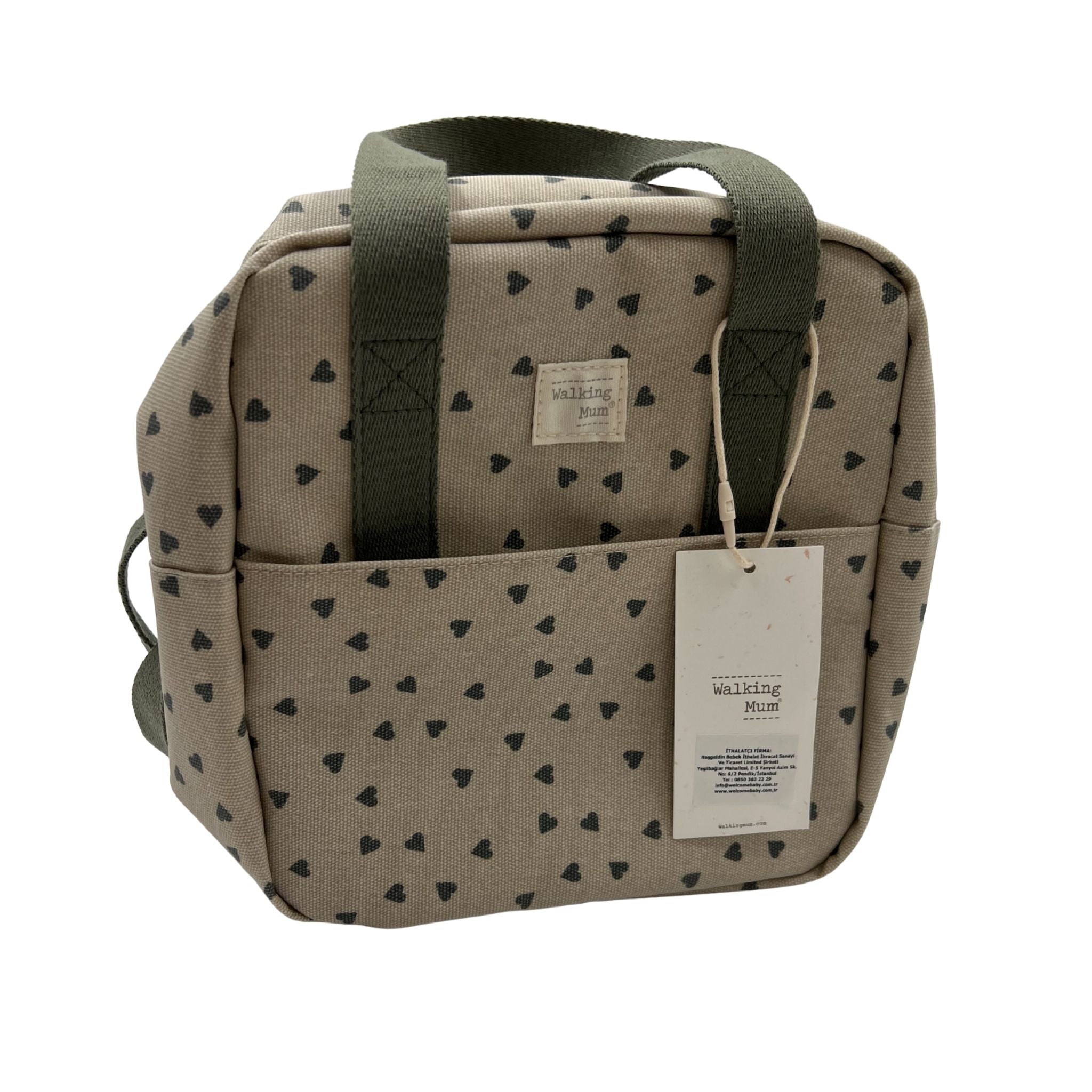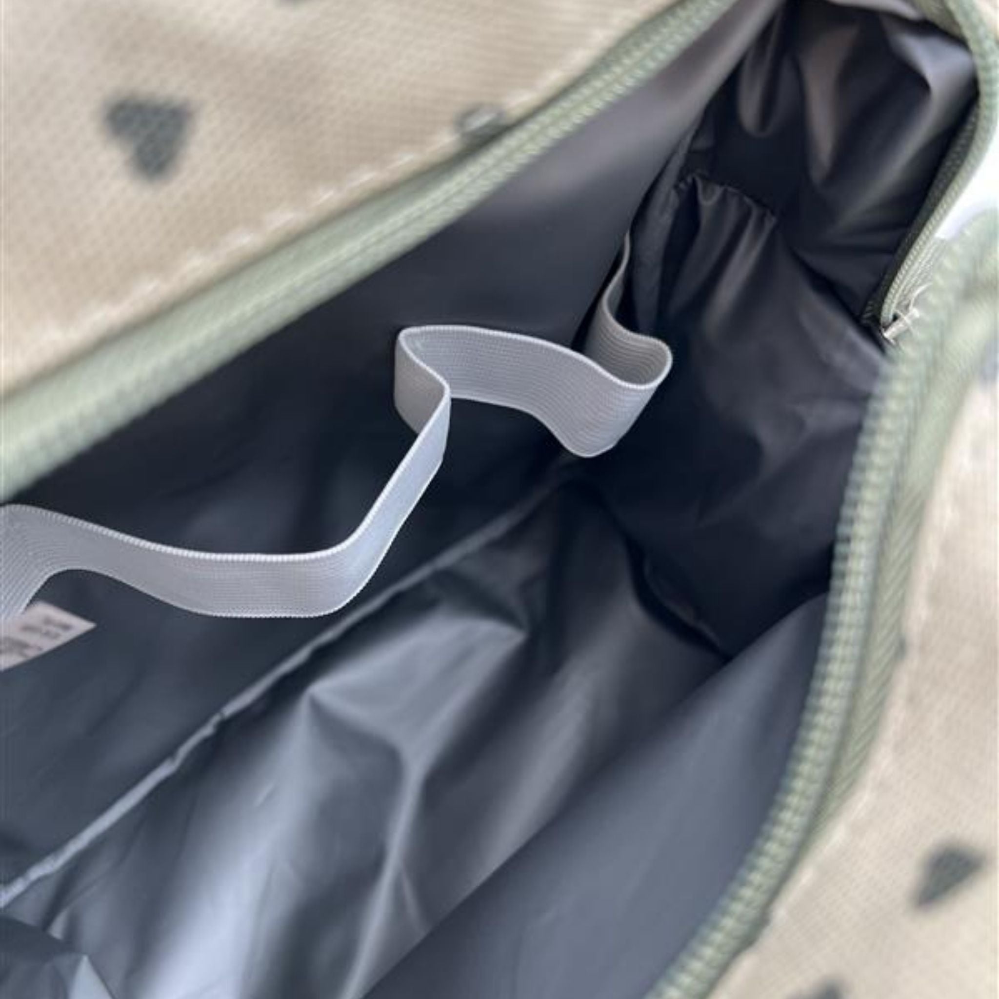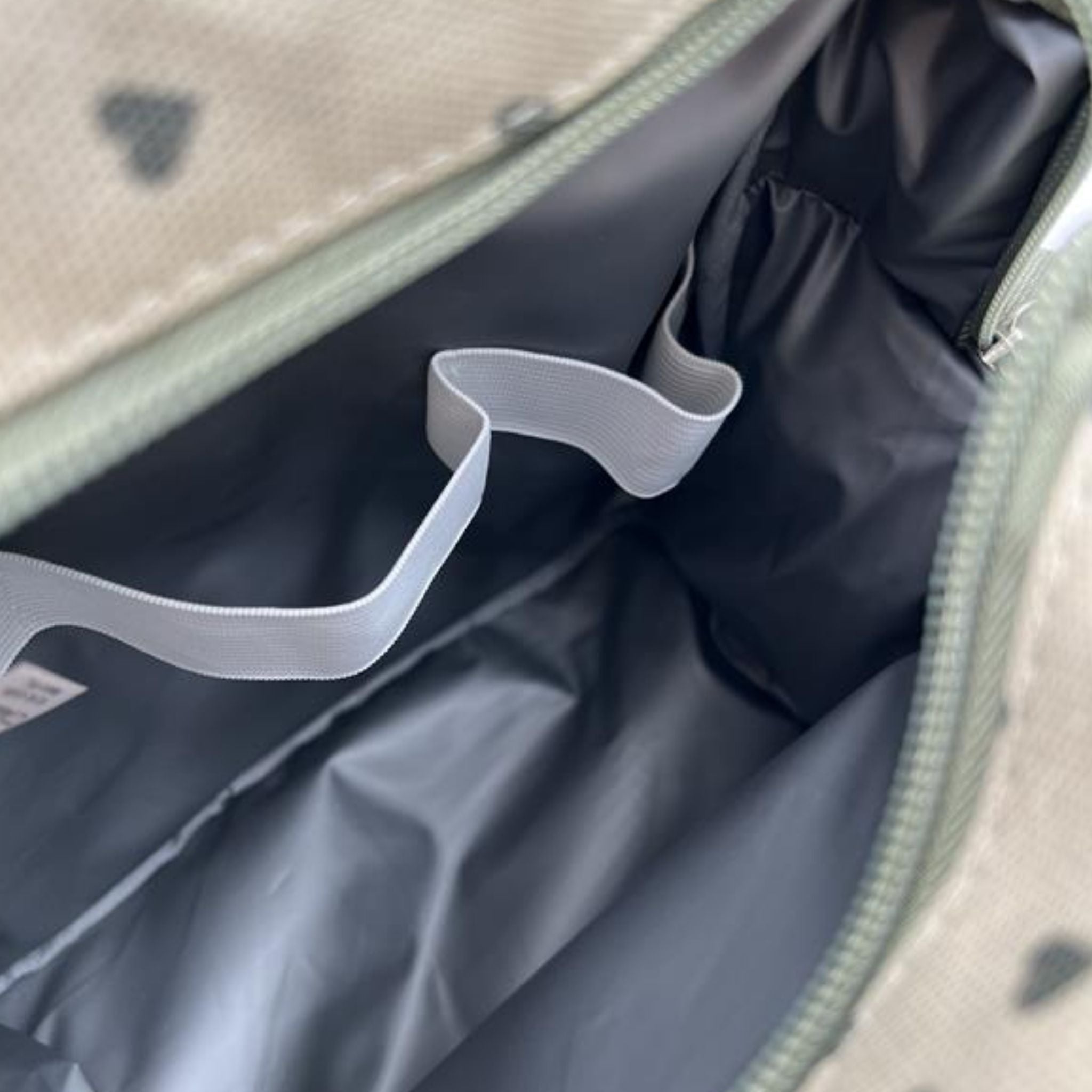 Walking Mum Poppy Termos Çantası Moss serisine ait termal biberon çantası, zarif tasarımı ve yüksek fonksiyonelliğiyle annelerin en büyük yardımcısı olmaya aday. Şehirli ve modern tarzı yansıtan bu özel çanta, bebeğinizin biberonunu dört saate kadar ideal sıcaklıkta muhafaza eder. Isıyı koruyan yalıtımlı iç yüzeyi sayesinde hem dış mekan aktivitelerinde hem de kısa gezilerde kullanım kolaylığı sağlar. Yumuşak tonlarda tasarlanmış kalp desenli kumaşı, stil sahibi ebeveynlere hitap ederken, kaliteli kaplamalı pamuk yapısı uzun süreli dayanıklılık sunar. Azo boya ve zararlı kimyasallardan arındırılmış olması ile bebeğinizin sağlığını ön planda tutar. Omuz askısı ve elde taşımaya uygun kısa sapıyla ergonomik kullanım imkânı sunan bu kompakt çanta, her çantaya kolaylıkla sığar.