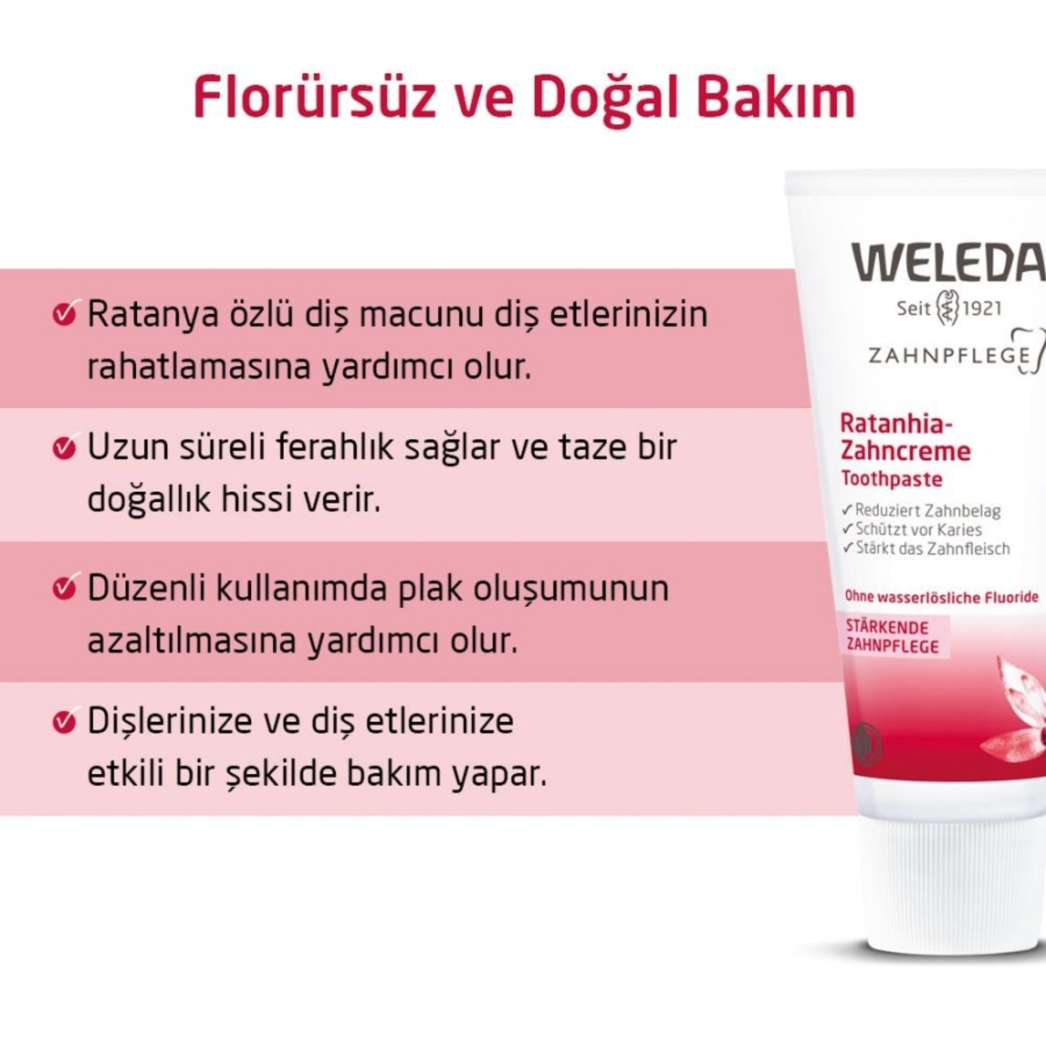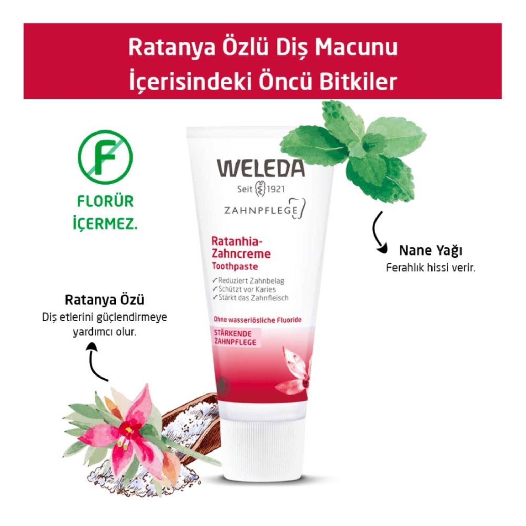 Weleda Ratanya Özlü Organik Diş Macunu, hassas diş etlerine nazikçe bakım yaparak ağız sağlığını destekleyen bitkisel içerikli özel bir formüle sahiptir. Peru Andları’nda yetişen Ratanya bitkisi kökü, tanen açısından zengin yapısıyla diş etlerini güçlendirir, kanama ve tahrişin azalmasına yardımcı olur. Kalsiyum karbonat mineralleriyle dişleri etkili şekilde temizlerken, nane ve spearmint yağları ağızda uzun süreli ferahlık sağlar. Diş hekimleriyle birlikte geliştirilen bu özel formül, florür, SLS ve paraben gibi zararlı maddeler içermez. Weleda’nın doğaya saygılı üretim anlayışıyla hazırlanan bu diş macunu, diş ve diş etlerini doğal yollarla korumaya yardımcı olur. Weleda Ratanya Özlü Organik Diş Macunu, doğal bileşenleriyle hassas diş etlerine nazik bakım yaparken, uzun süreli ferahlık ve sağlıklı bir ağız bakımı sağlar.
